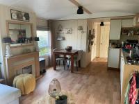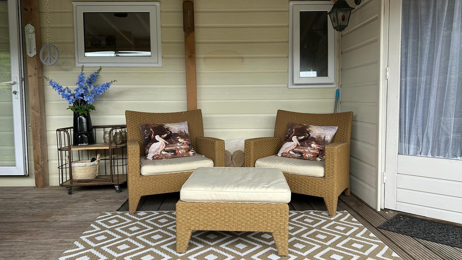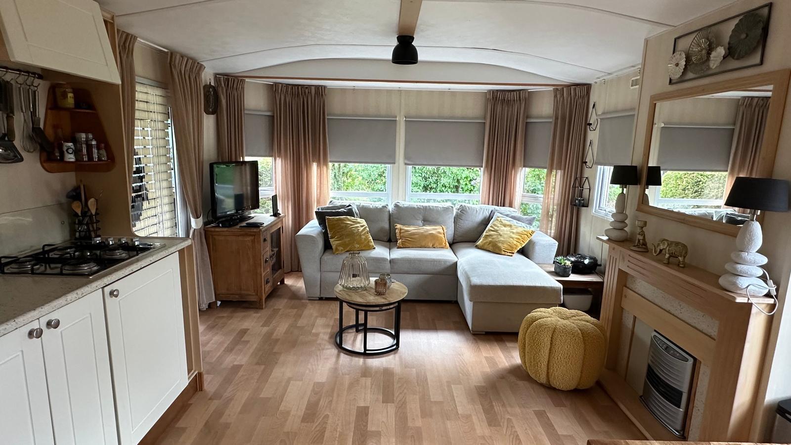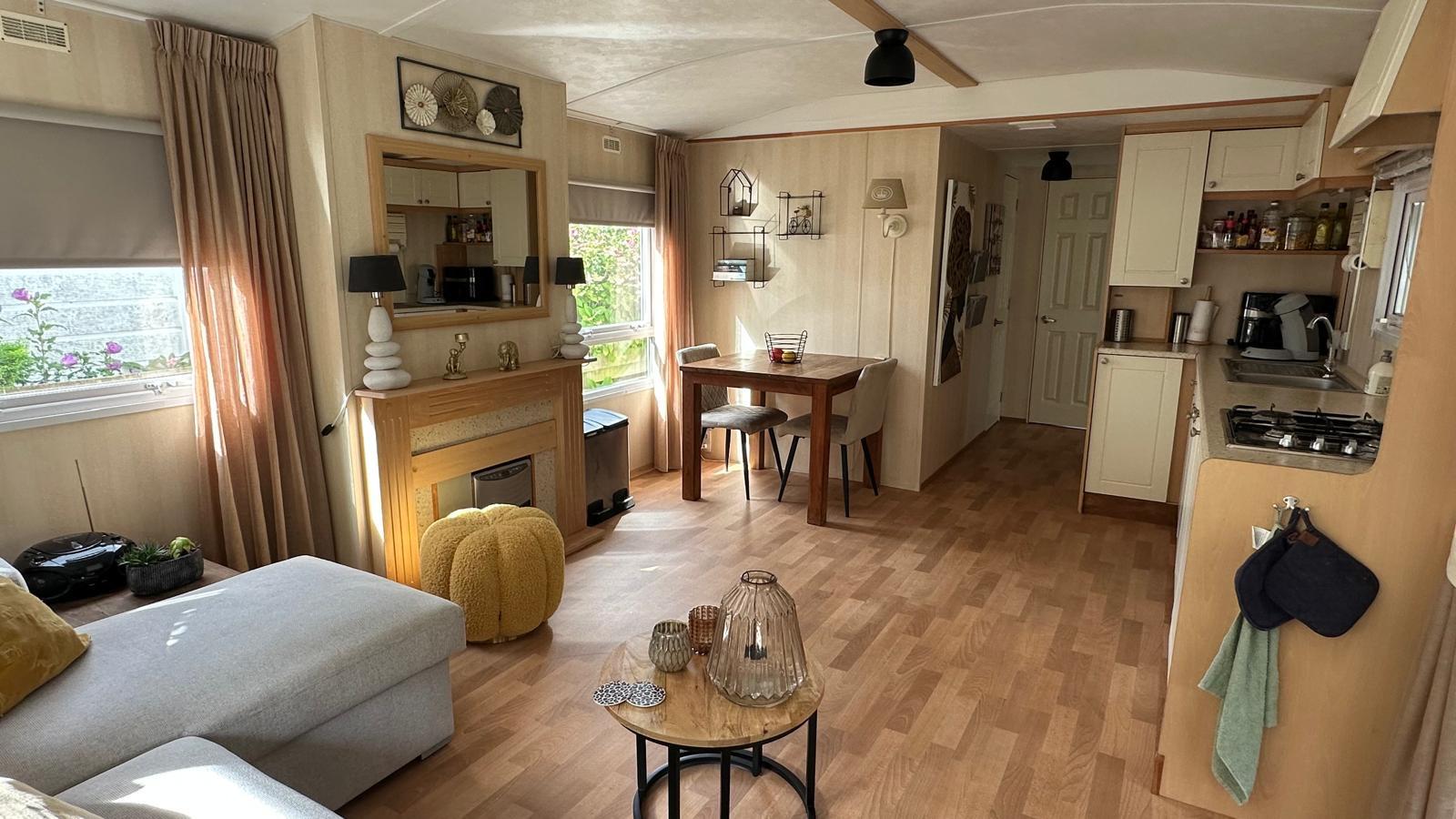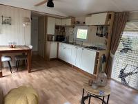 Das geräumige Wohnzimmer bietet viel Wohnkomfort und die Gartentüren führen direkt auf die Veranda, was für ein wunderbares zusätzliches Wohnvergnügen sorgt. Das Chalet wird komplett mit einem (Schlaf-)Sofa, einem Ottomanen, einem Couchtisch, Möbeln + Fernseher sowie einem Kaminsims mit zwei Stehlampen und einem großen Spiegel geliefert. Im Essbereich gibt es einen Tisch mit zwei Stühlen. Rollos und Vorhänge vor den Fenstern sorgen für ausreichend Privatsphäre. Der Raum wird mit einem Zibro-Heizofen beheizt.
