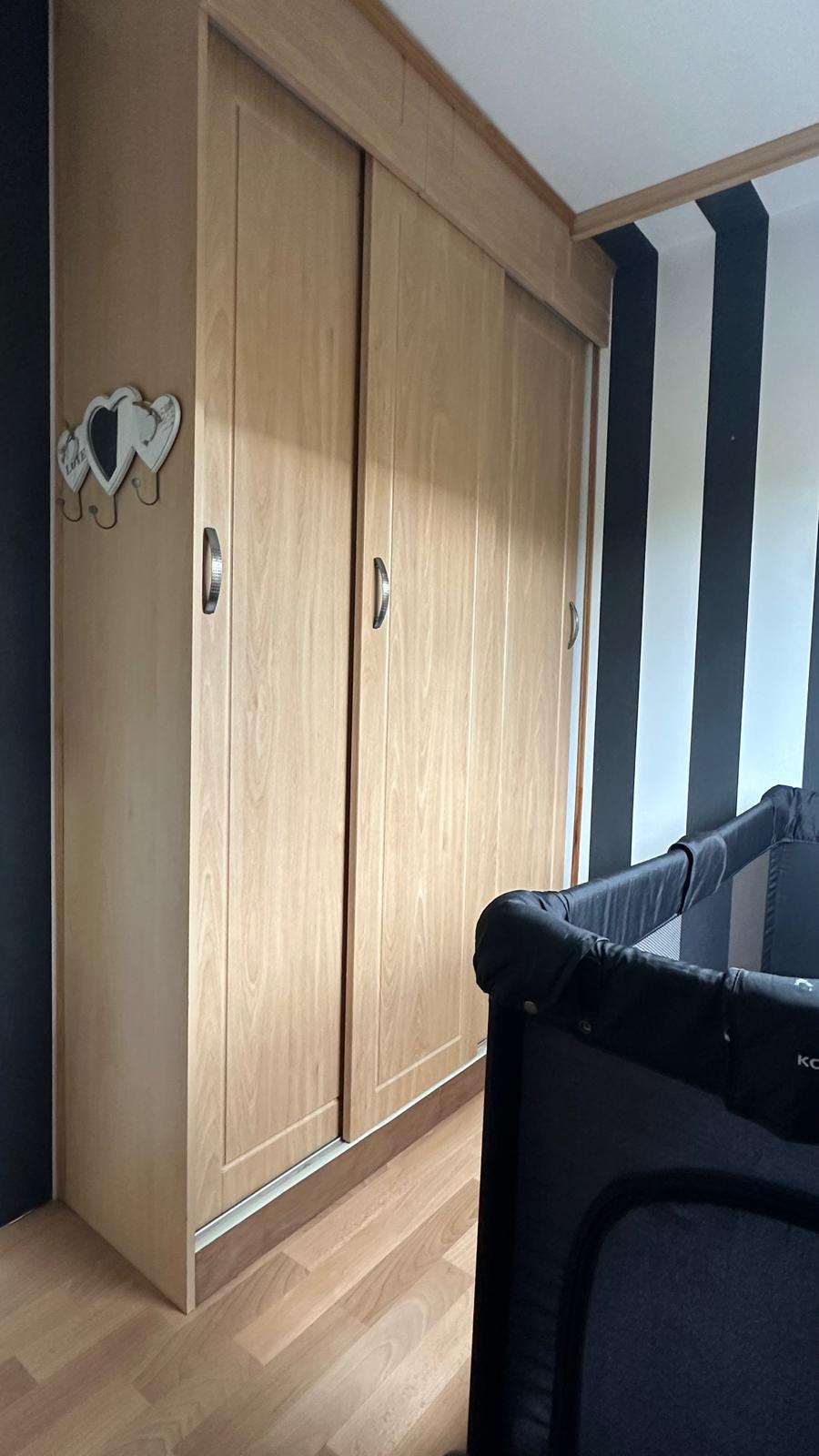 Das Hauptschlafzimmer verfügt über ein Doppelbett, zwei Kleiderschränke und ein offenes Regal. Das zweite Schlafzimmer bietet einen großen Kleiderschrank mit Schiebetüren und ein Wandregal. Außerdem ist ausreichend Platz für ein Einzelbett oder ein Etagenbett vorhanden. Die Fenster in beiden Zimmern sind mit Verdunkelungsrollos ausgestattet. Das Schlafsofa im Wohnzimmer bietet Platz für zwei weitere Personen.