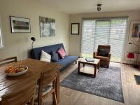 Das Wohnzimmer ist dank der großen Fenster an der Vorderseite und der Fenstertüren zur Terrasse wunderbar hell. Dank Jalousien und Vorhängen vor den Fenstern können Sie die Helligkeit und Privatsphäre ganz einfach anpassen. Das Wohnzimmer verfügt über ein Schlafsofa, einen Couchtisch, einen Sessel, ein offenes Regal und einen Esstisch mit vier Stühlen. Die Beheizung erfolgt über Elektroradiatoren.