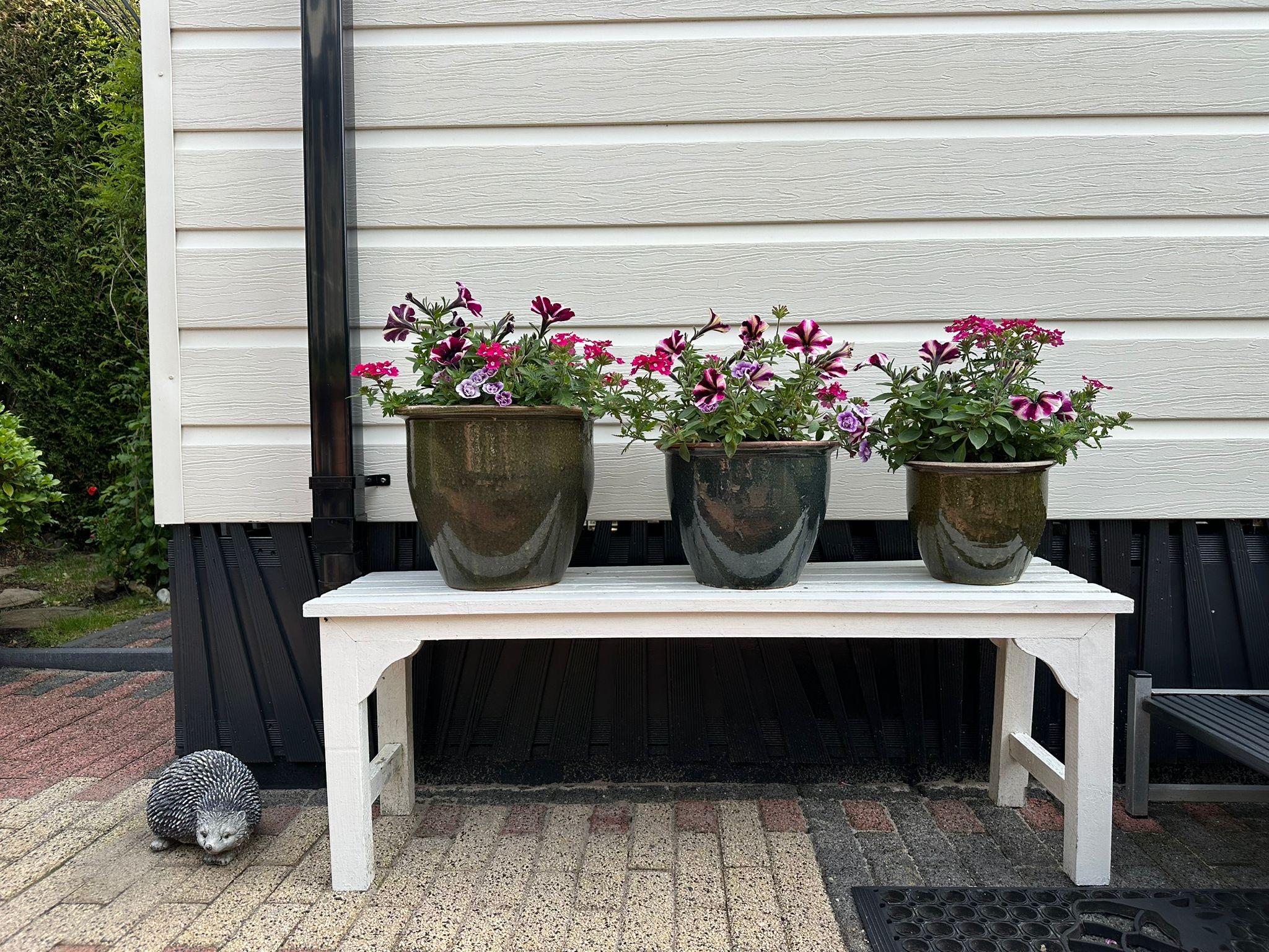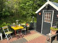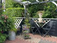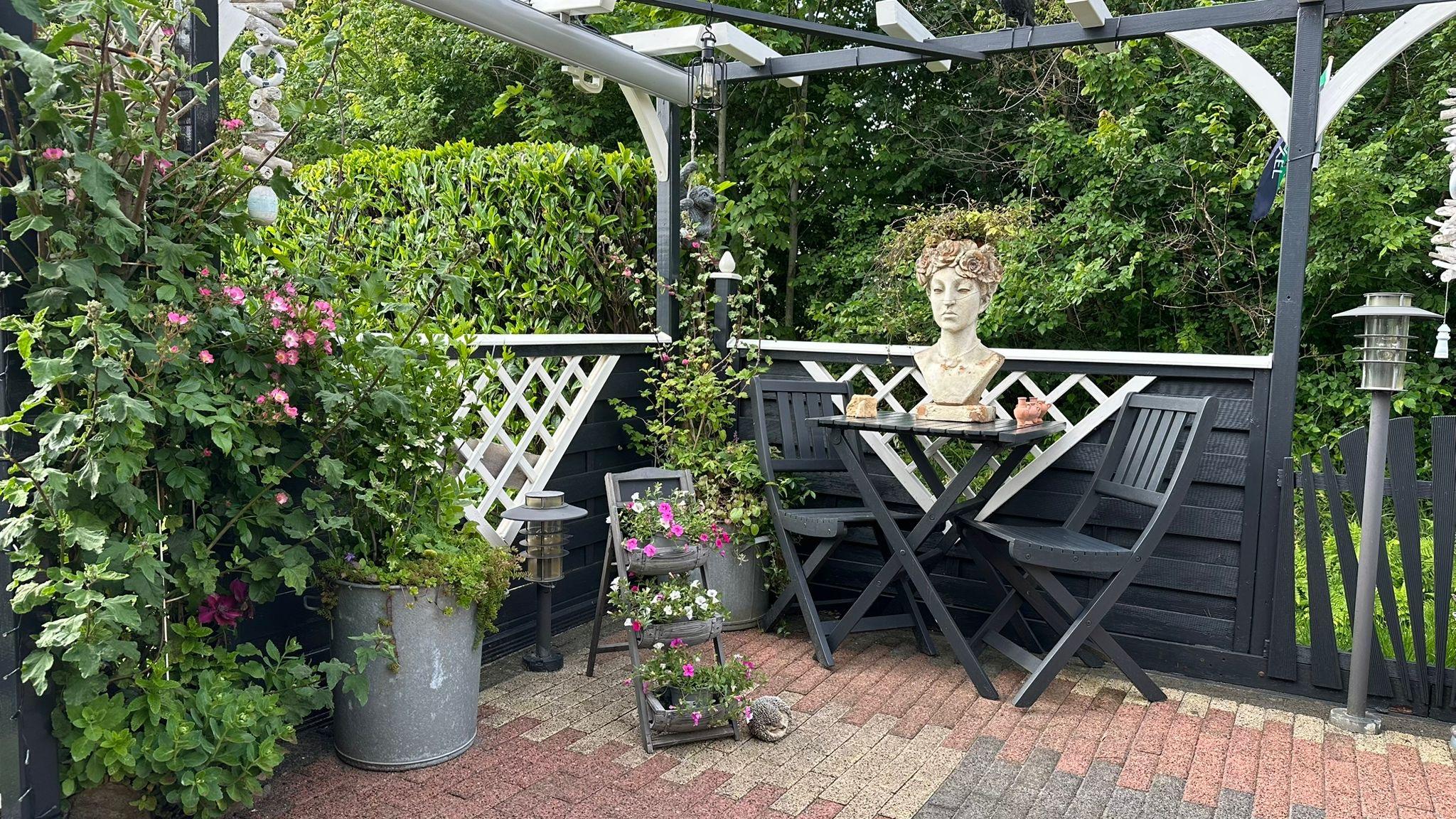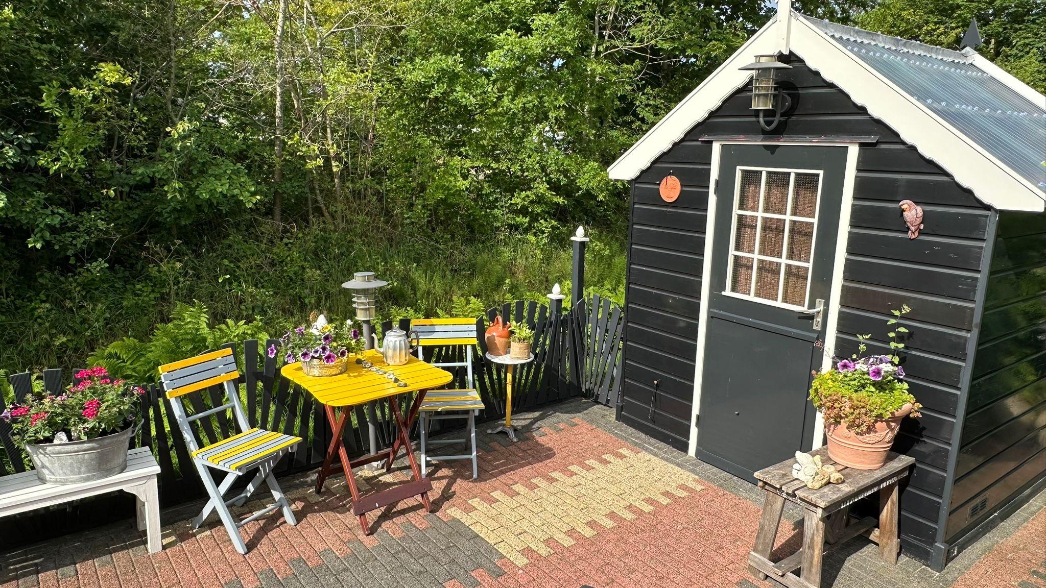 Ein schöner, sonniger Garten ist mit einem Holzzaun und einer grünen Hecke umgeben. Die Terrasse ist wunderschön mit Pflastersteinen in einem schönen Motiv angelegt und mit farbenfrohen Pflanzen geschmückt. Sie bietet ausreichend Platz für mehrere Sitzgelegenheiten und eine schöne, geschützte Terrasse mit Glaswänden. Im Garten befindet sich ein Holzschuppen mit Gartengeräten.