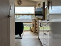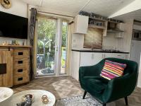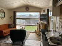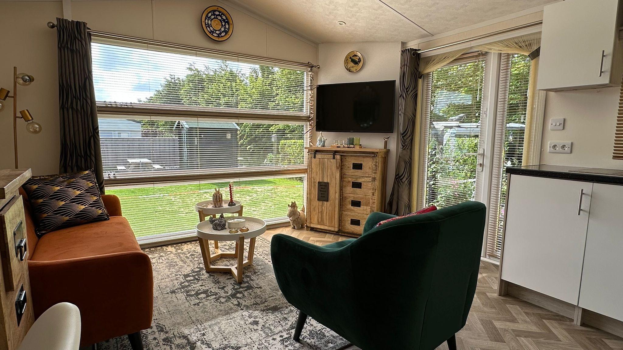 Ein wunderschön modern eingerichtetes Wohnzimmer mit Fischgrätboden und schönen großen Fenstern an der Vorderseite sowie einer Tür zur Terrasse. Die Fenster sind mit attraktiven Lamellen und Fliegengittern ausgestattet, sodass Sie sie zum Lüften geöffnet lassen können. Das Chalet verfügt über ein Sofa, zwei Beistelltische, eine Tischlampe, einen Teppich, einen Sessel, einen Fernseher, Möbel, einen Schrank, eine Kommode und zwei Stühle. Die Beheizung erfolgt über eine Zentralheizung.