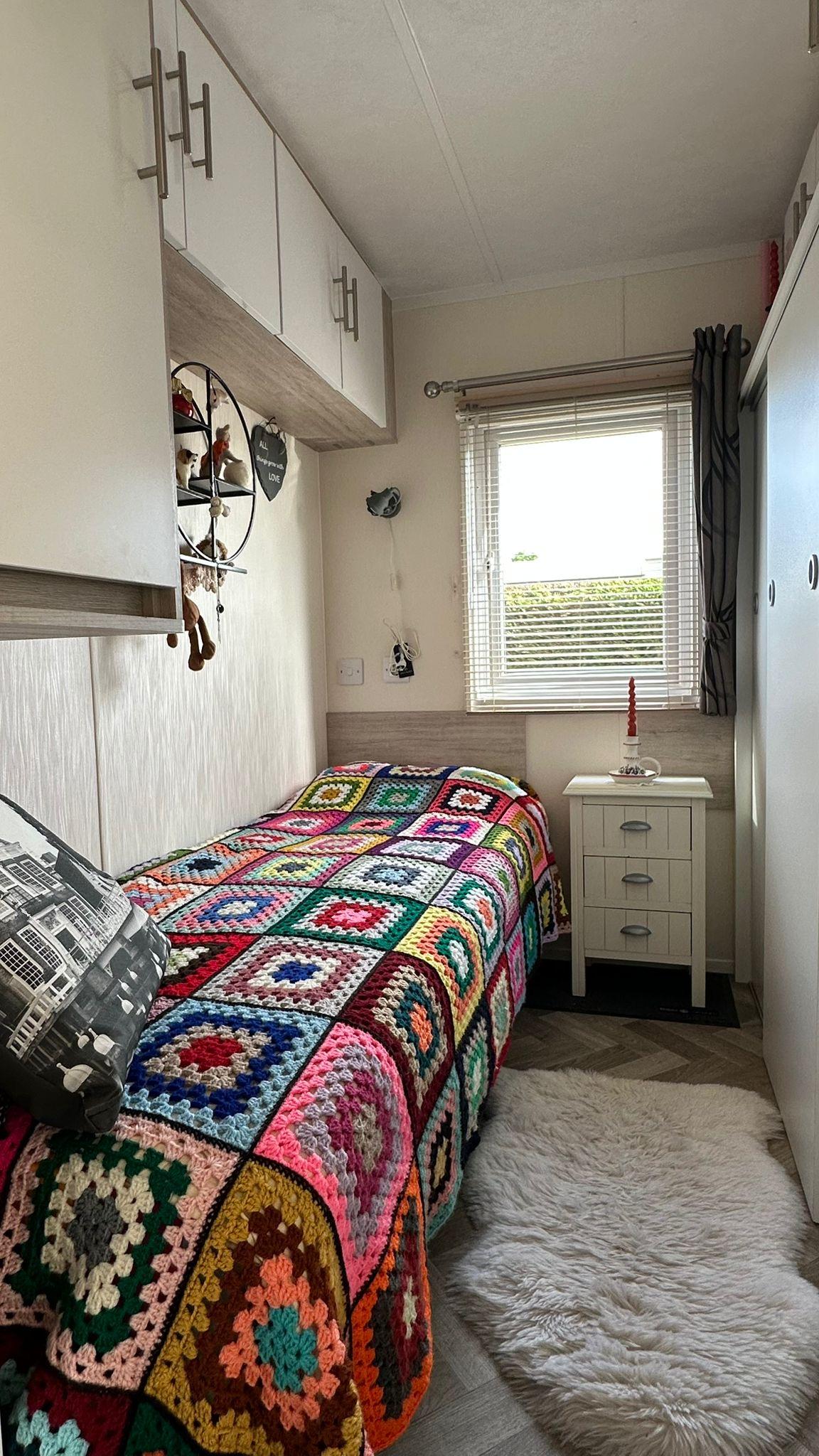 Das charmante Hauptschlafzimmer verfügt über ein Doppelbett, zwei Nachttische und einen großen Kleiderschrank – ideal für all Ihre Habseligkeiten. Im zweiten Schlafzimmer finden Sie ein Einzelbett, einen Nachttisch, Wandschränke und einen geräumigen Kleiderschrank mit Schiebetüren.