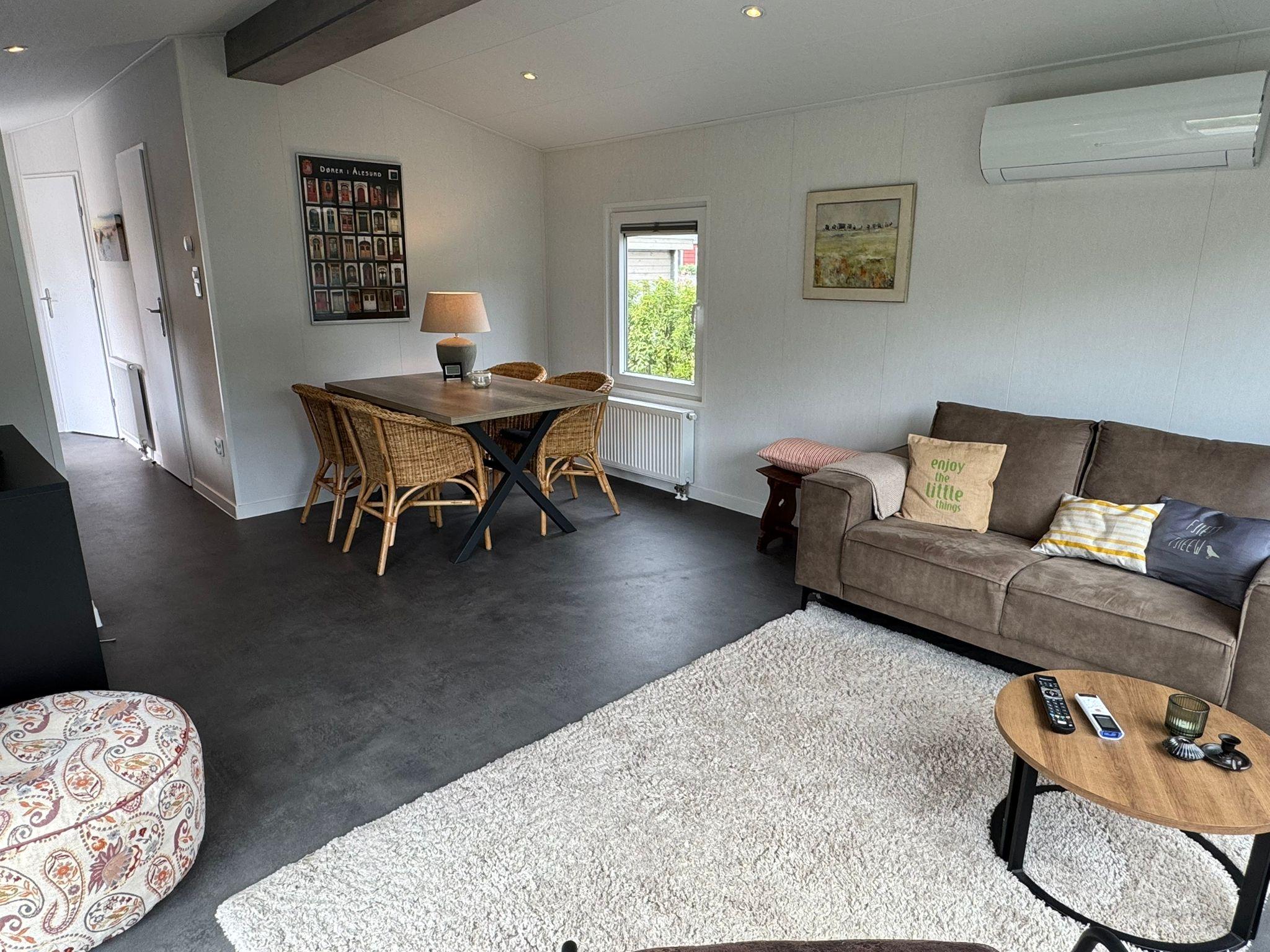 Das schöne, geräumige Wohnzimmer verfügt über ein Sofa, einen Couchtisch, einen Schrank mit Fernseher, einen Sessel, einen Beistelltisch, eine Wandleuchte und einen Esstisch mit vier Stühlen. Glastüren führen direkt auf die nach Südosten ausgerichtete Terrasse. Zwischenvorhänge ermöglichen eine regulierbare Tageslichtmenge und bieten ausreichend Privatsphäre. Das Chalet wird über eine Zentralheizung beheizt und über eine Klimaanlage gekühlt.