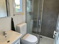 Das Badezimmer verfügt über eine geräumige Dusche, ein WC und einen Waschtisch mit Spiegel.