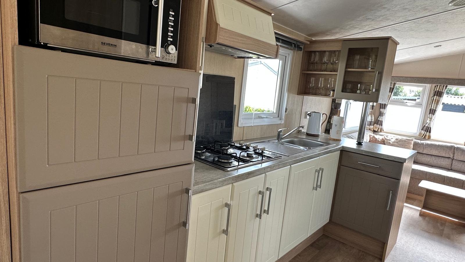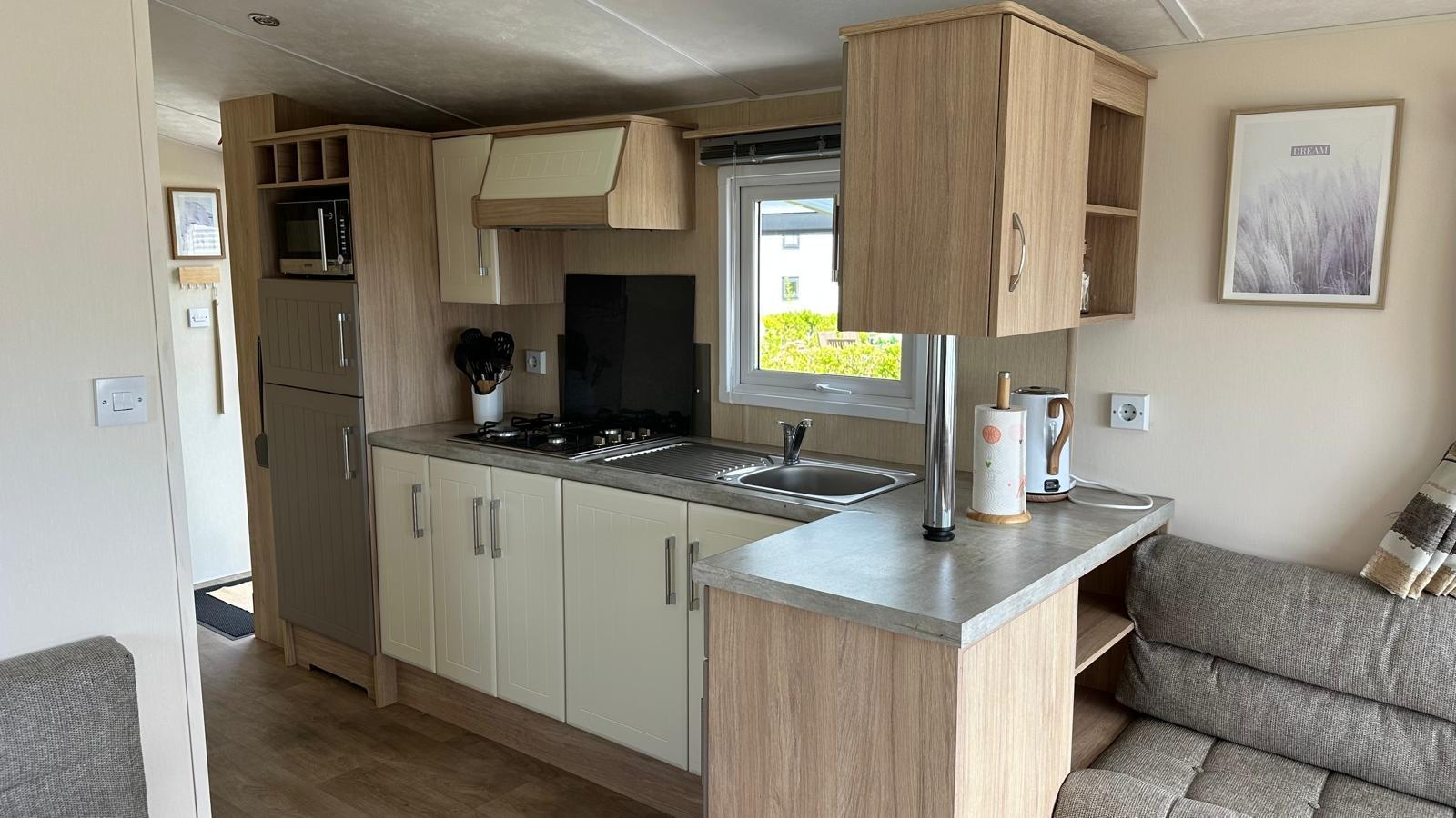 Die Küche ist mit Kühlschrank, Gefrierschrank, Spüle, 4-Flammen-Gasherd mit Dunstabzugshaube, Mikrowelle und viel Stauraum ausgestattet.