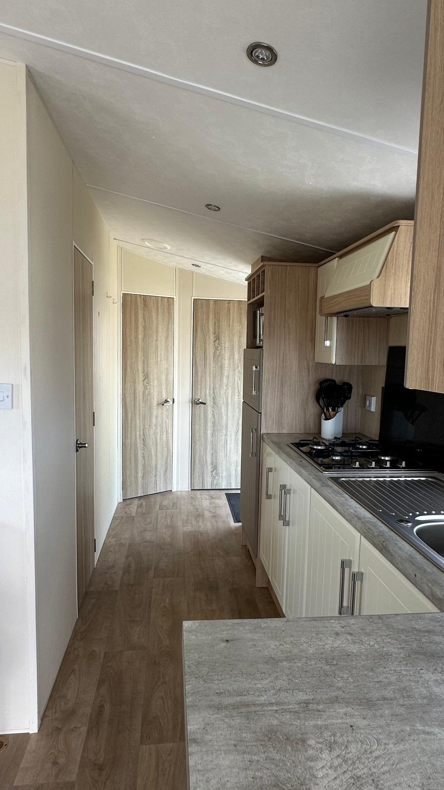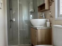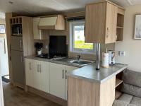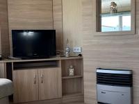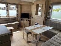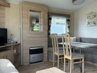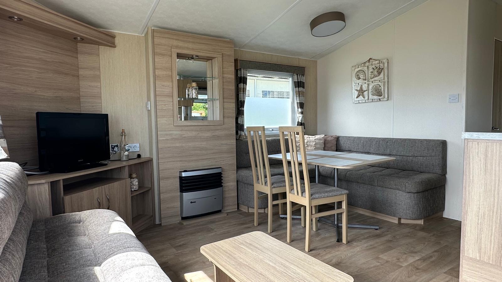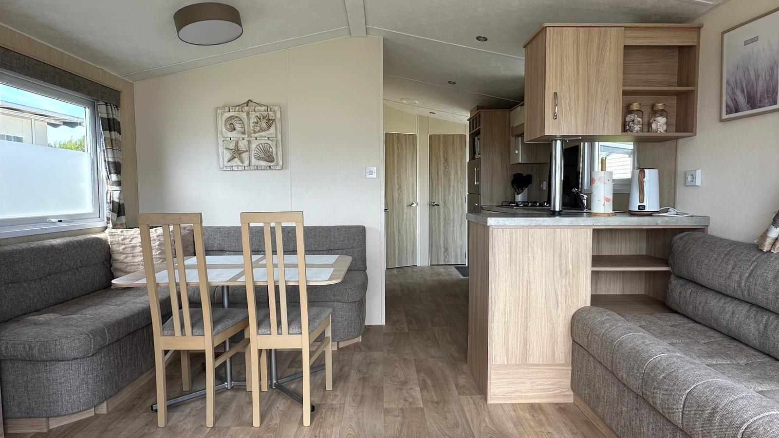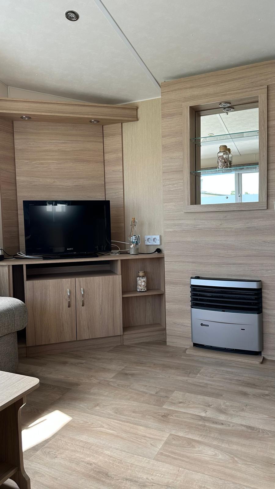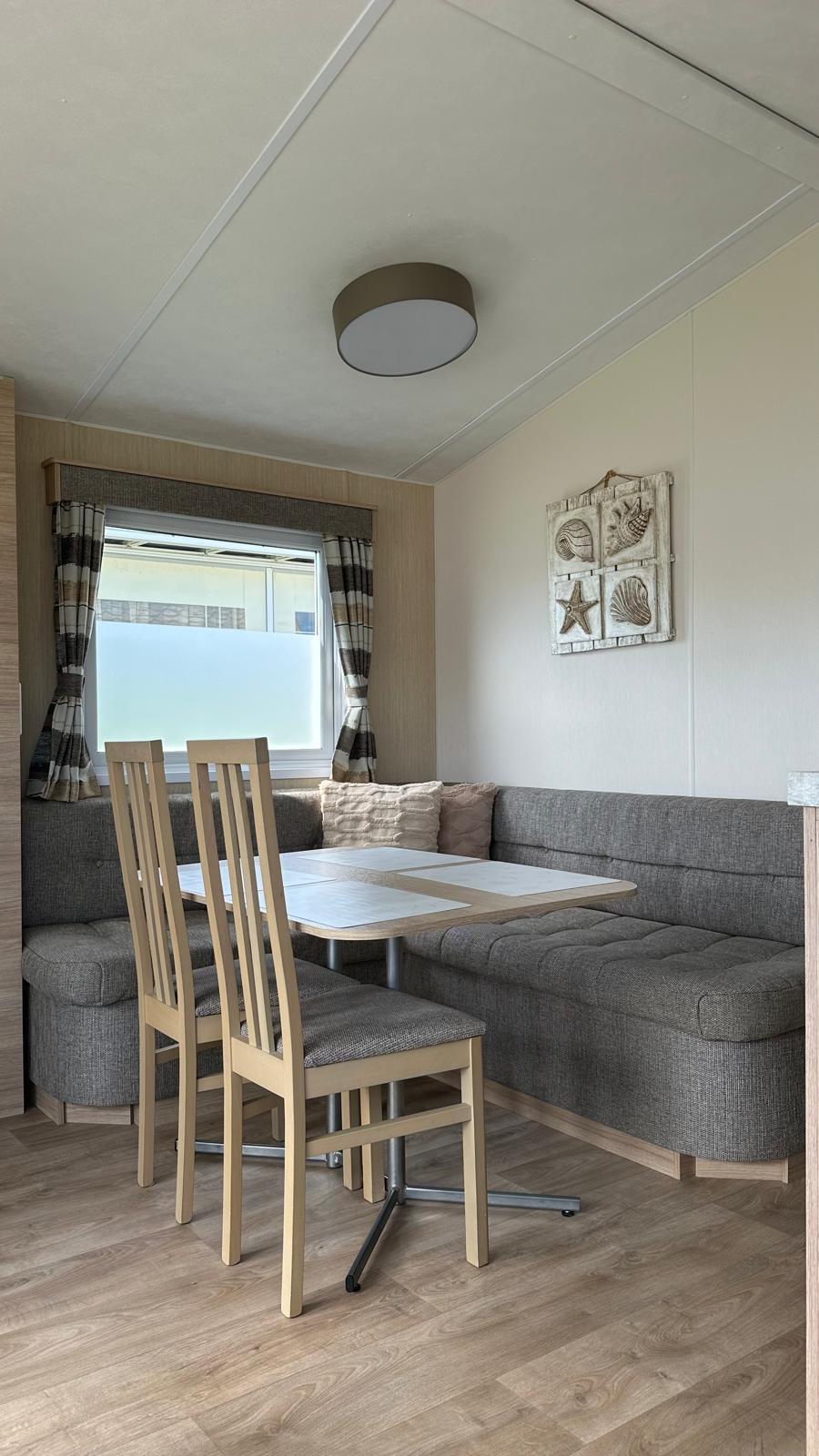 Das gemütliche Wohnzimmer ist mit einem Ecksofa, einem Couchtisch, Möbeln und einem Fernseher ausgestattet. Der Essbereich verfügt über ein Ecksofa mit Esstisch und zwei Stühlen. Helle Farben im gesamten Chalet schaffen eine entspannte Atmosphäre, und es gibt ausreichend Sitzgelegenheiten für alle. Der Raum wird mit einer Truma-Heizung beheizt.