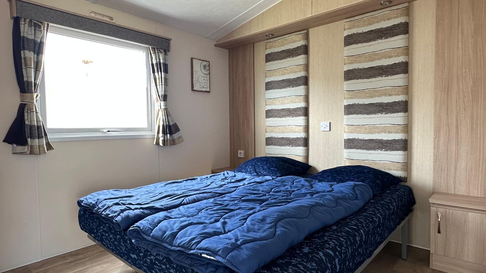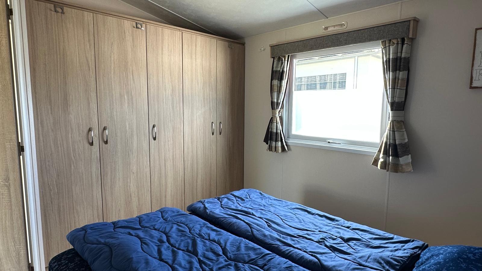 Das Hauptschlafzimmer verfügt über ein Doppelbett, zwei Nachttische und einen großen, wandfüllenden Kleiderschrank. Das zweite Schlafzimmer bietet zwei Einzelbetten, einen Nachttisch und ein Wandregal.