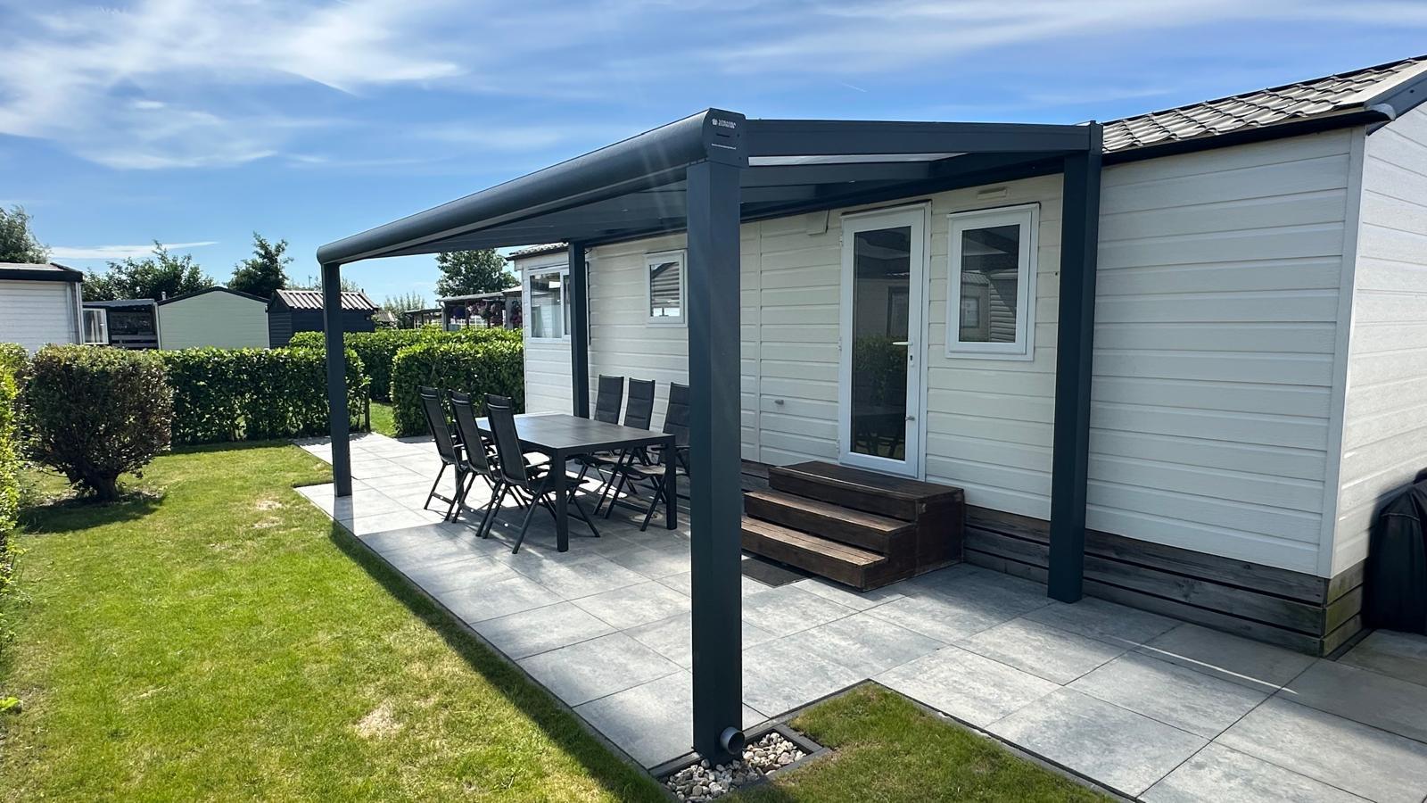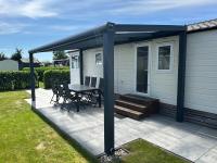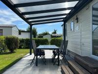 Ein schöner, sonniger Garten, größtenteils von einer grünen Hecke umgeben. Durch den Eingang gelangen Sie auf die gepflasterte Terrasse mit der schönen überdachten Terrasse (2023). Hier können Sie am großen Gartentisch mit sechs Stühlen die Ruhe genießen. Auch bei schlechtem Wetter ist es ein wunderbarer Ort, draußen zu sitzen und die langen Sommerabende zu genießen, da die überdachte Terrasse über eine integrierte Beleuchtung verfügt. Angrenzend an die Terrasse befindet sich eine Rasenfläche, und Sie haben einen eigenen Parkplatz vor dem Chalet.