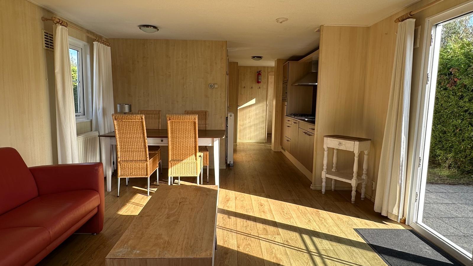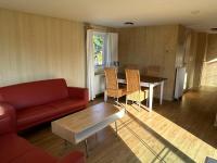 Das Chalet wird wie besichtigt verkauft. Das Wohnzimmer ist mit zwei Ledersofas, einem Couchtisch, einem TV-Möbel, einer Tischlampe und einem Essbereich mit Tisch und vier Stühlen ausgestattet. Das große Fenster und die Glastüren sorgen für viel Tageslicht, und Vorhänge an allen Fenstern sorgen für zusätzliche Privatsphäre. Zentralheizung ist vorhanden.