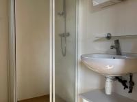 Das Badezimmer verfügt über eine Dusche, ein WC, ein Waschbecken mit Spiegelschrank und einen Waschmaschinenanschluss.