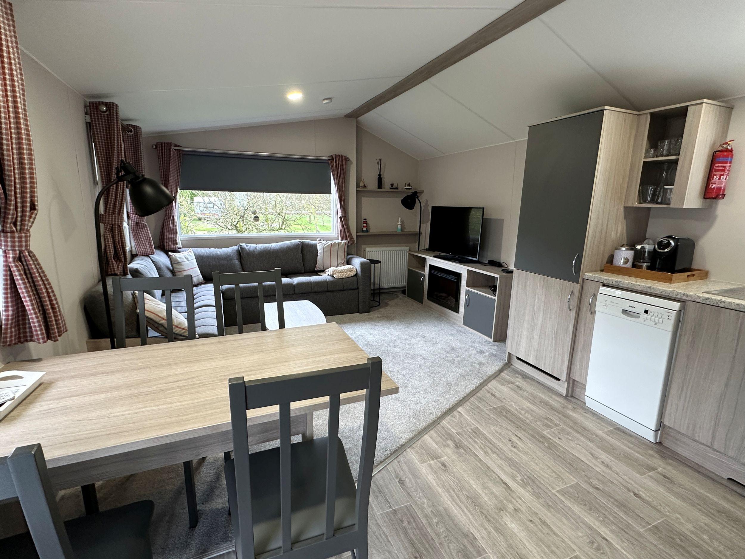 Der Wohnbereich ist unterteilt in die Sitzecke mit einem herrlichen großen Ecksofa und die Küche mit Esszimmergarnitur. Dank der Zentralheizung können Sie auch in den kälteren Monaten des Jahres komfortabel genießen.
