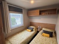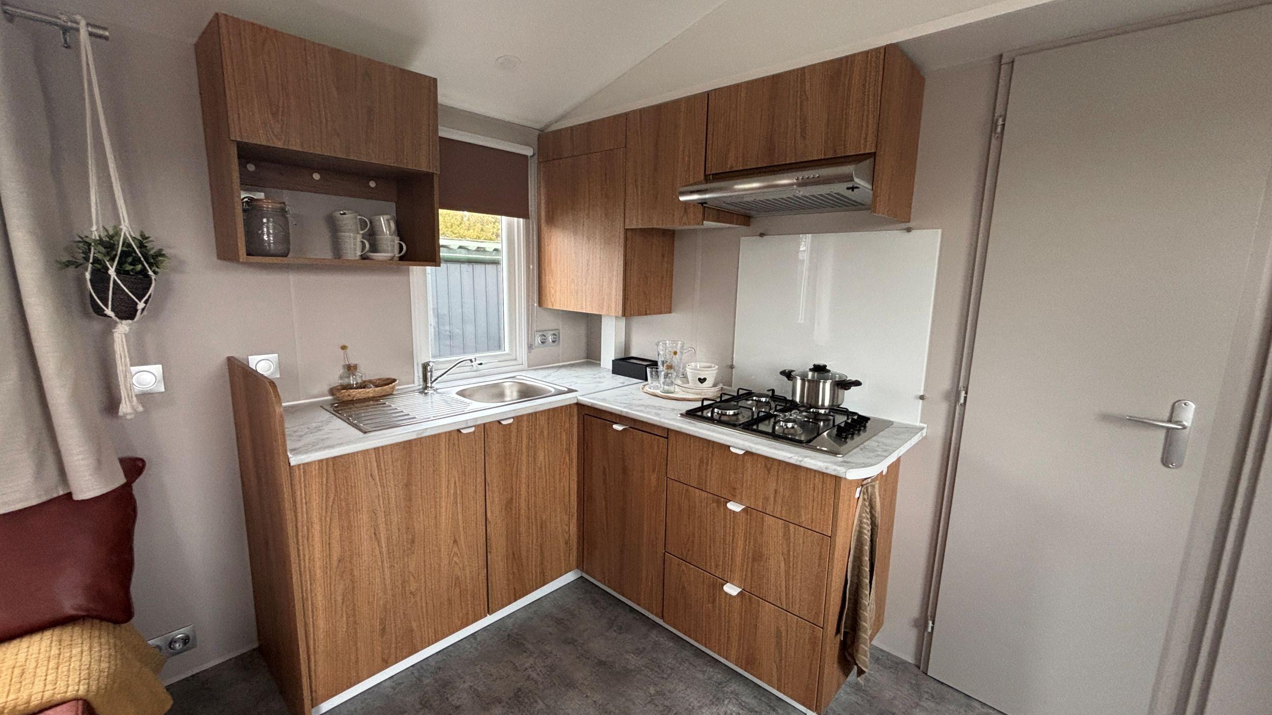 Das IRM Azalée hat einen zentralen Raum mit einem eingebauten Schlafsofa, eine komplett ausgestattete Küche mit unter anderem einem Kühl-Gefrierschrank, einem Gasherd, einem Geschirrspüler und einer Dunstabzugshaube. Der Esstisch hat eine eingebaute Verlängerung, was Platz spart, aber sehr praktisch ist, wenn mehrere Personen anwesend sind. Die beiden Schlafzimmer mit geräumigen Betten sind ausgezeichnet und das Badezimmer mit Dusche und Waschbecken sieht ebenfalls wunderschön aus. Es gibt eine separate Toilette. Das Mobilheim wird mit einer Elektroheizung beheizt, als zusätzliche Option wurden Konvektoren in den Schlafzimmern gewählt, die im Frühling und Herbst für angenehmen Komfort sorgen. Die Kunststoffverkleidung des Mobilheims ist in einer Farbkombination aus Leinen und Muskat gehalten.