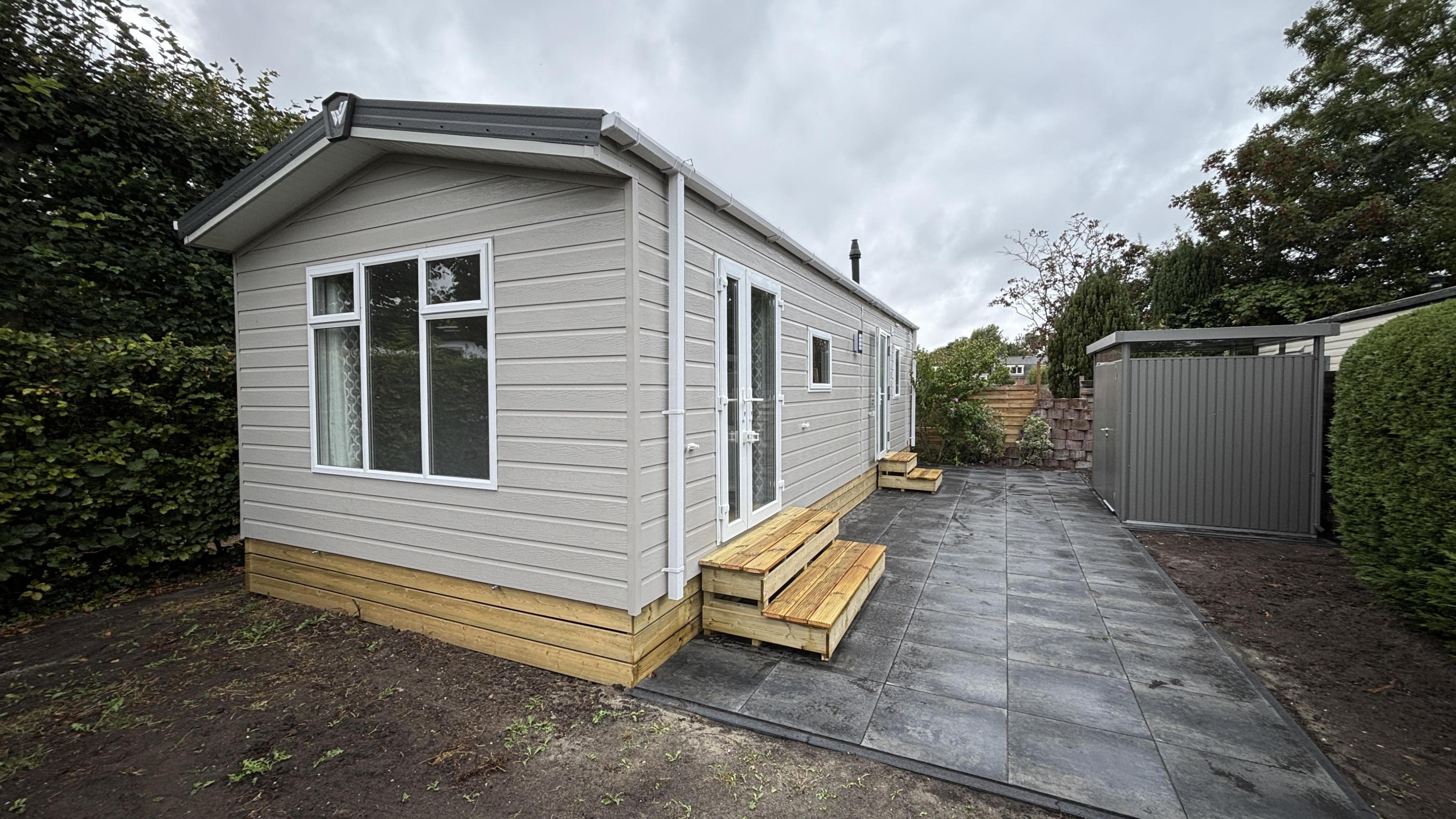 Das Mobilheim wird komplett schlüsselfertig übergeben, ist an der Unterseite sauber verarbeitet und verfügt über zwei großzügige Stufen sowie ein praktisches Gartenhaus, das das Bild abrundet. Das komplette Möbelpaket im Chalet kann übernommen werden, sodass Sie sofort unbeschwert genießen können.