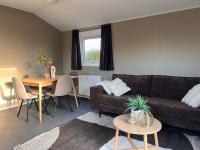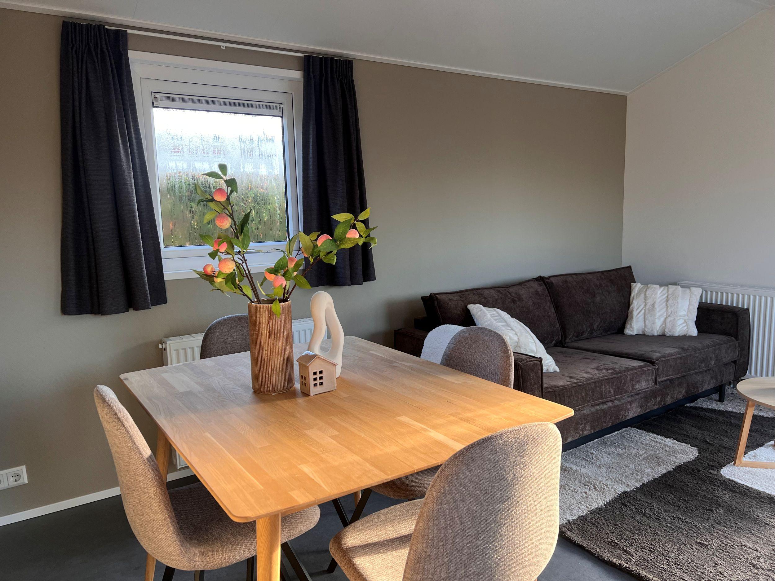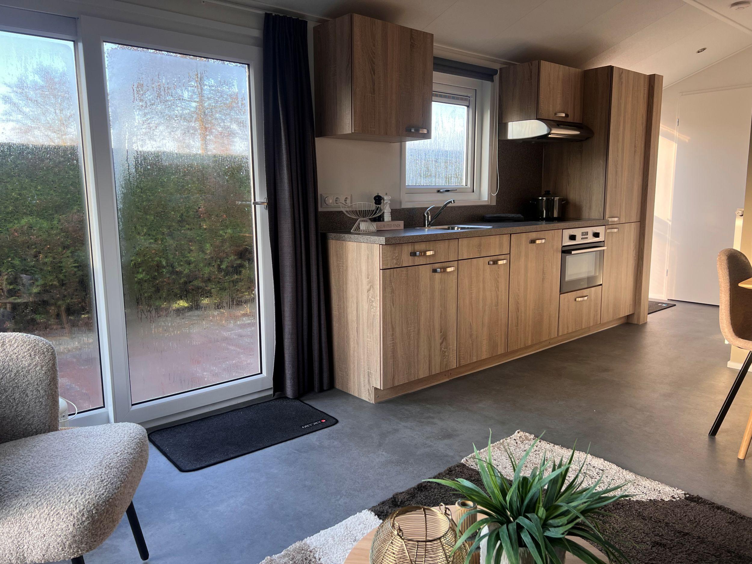 Die helle Küche ist mit Induktionskochfeld, Geschirrspüler, Kombimikrowelle und Kühl-Gefrierkombination ausgestattet. Das Wohnzimmer ist durch die raumhohen Fenster und die Schiebetüren sehr hell. Das Möbelpaket zeigt gut, wie man den Raum gut nutzen kann und ist möglicherweise über den Anbieter Zeeuwse Chalets zu erwerben.Das Chalet wird bequem mit Zentralheizung beheizt.