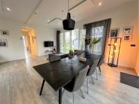 Im offenen Wohnbereich befinden sich die Sitzecke, der Essbereich und die Küche. Dank der großen Fenster genießen Sie nicht nur viel natürliches Licht, sondern auch eine einzigartige Aussicht nach draußen. Der Wohnbereich ist mit einem Sofa, einem Couchtisch und einem TV-Schrank mit einem Fernseher ausgestattet. Der CAI-Anschluss ist hier für den Empfang von Fernsehprogrammen zuständig. Auch Internet ist hier verfügbar. Der gemütliche Essbereich ist mit einem Esstisch und sechs Stühlen ausgestattet.