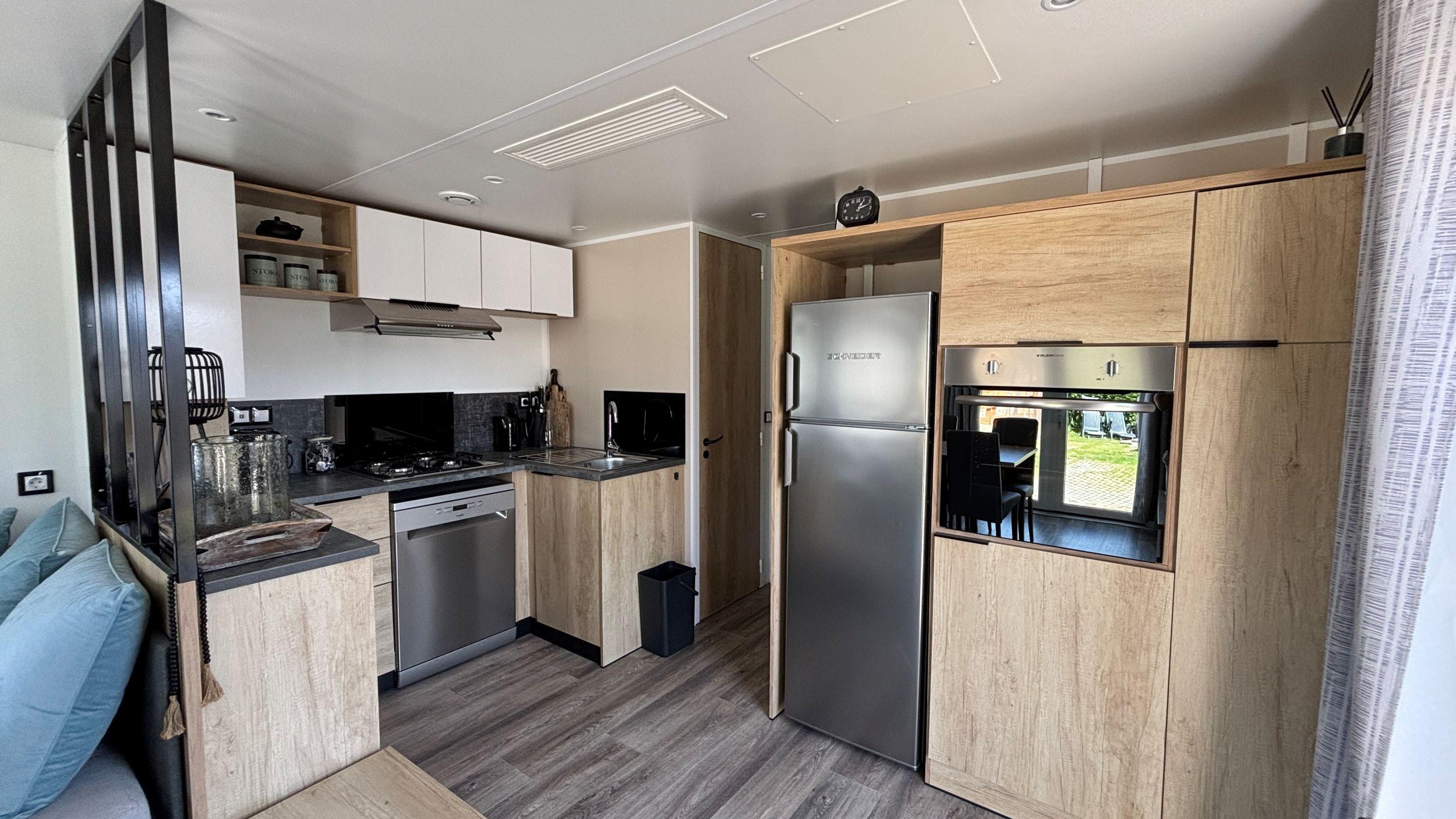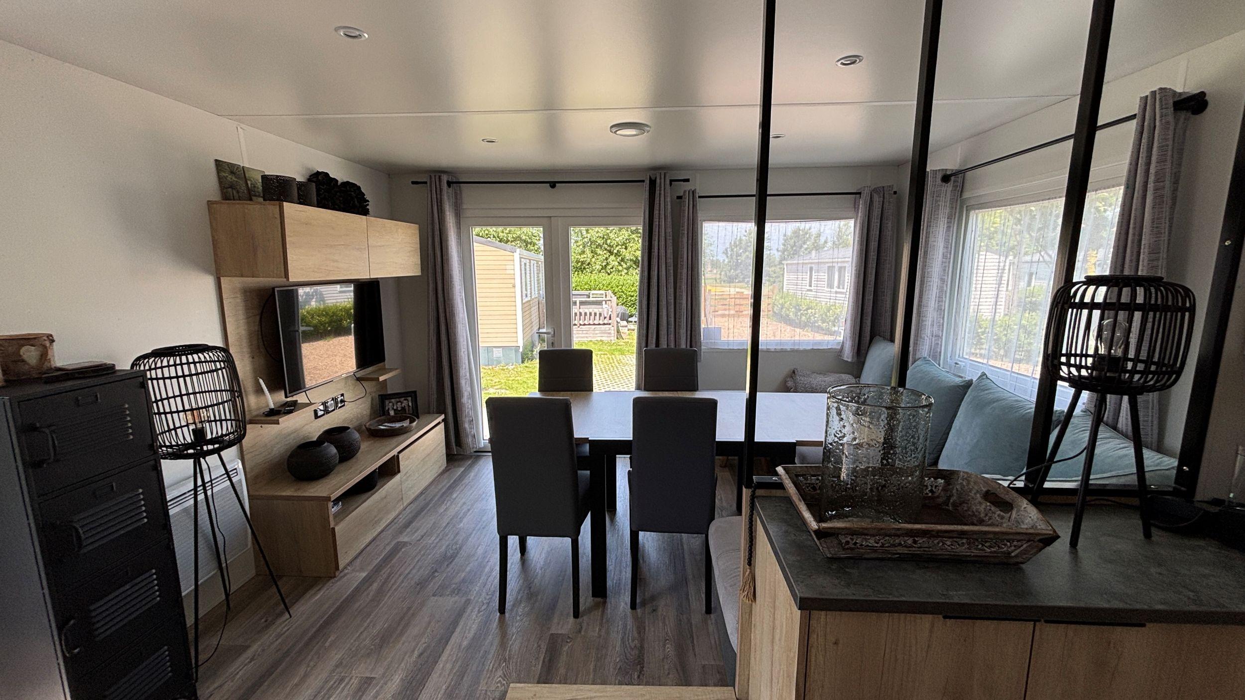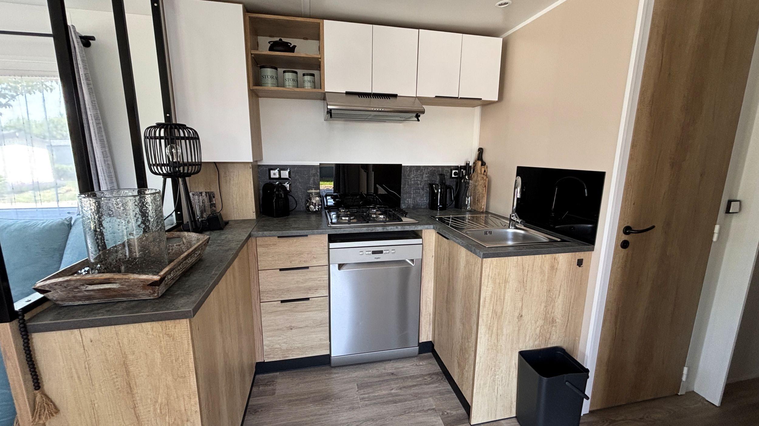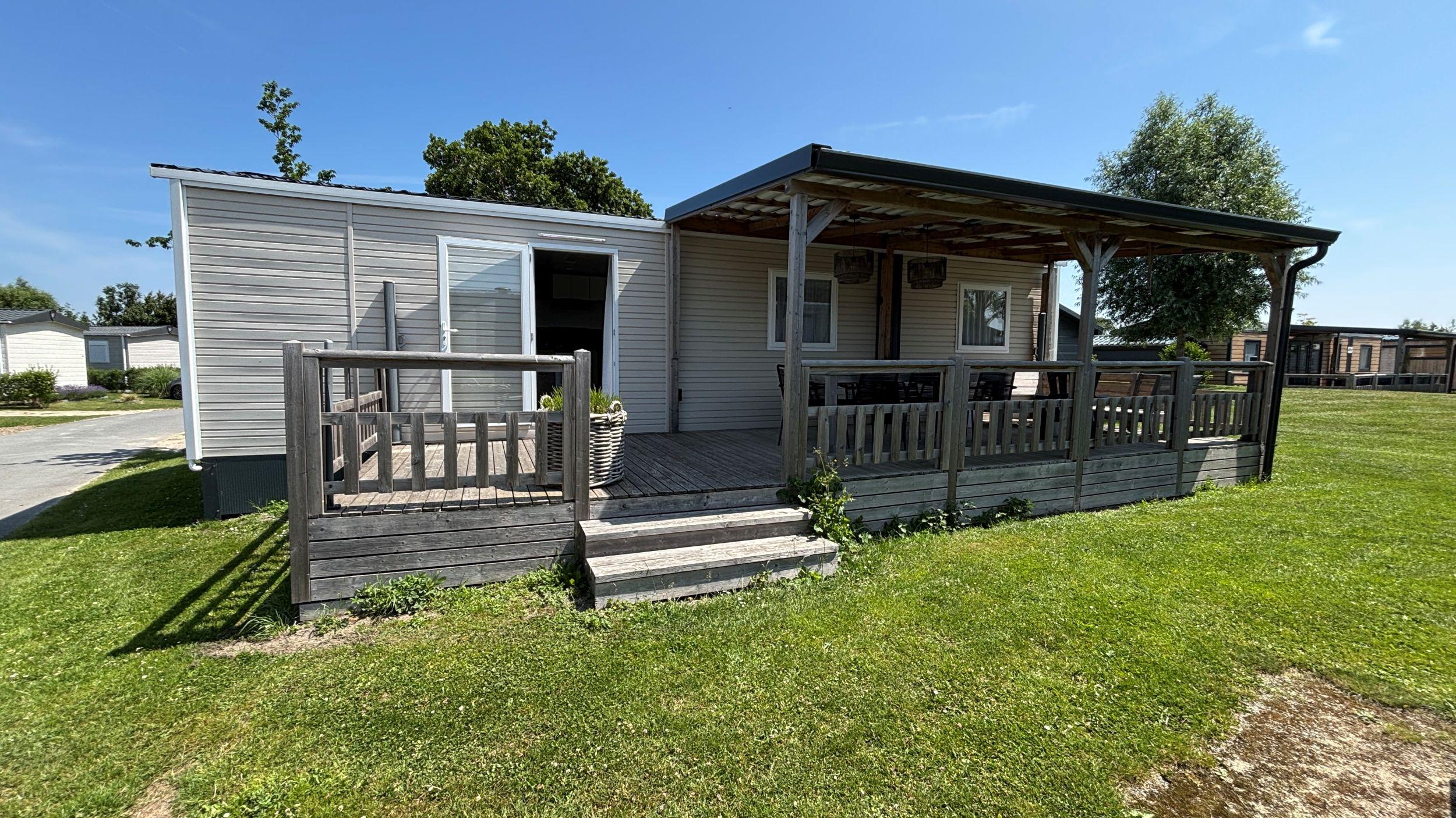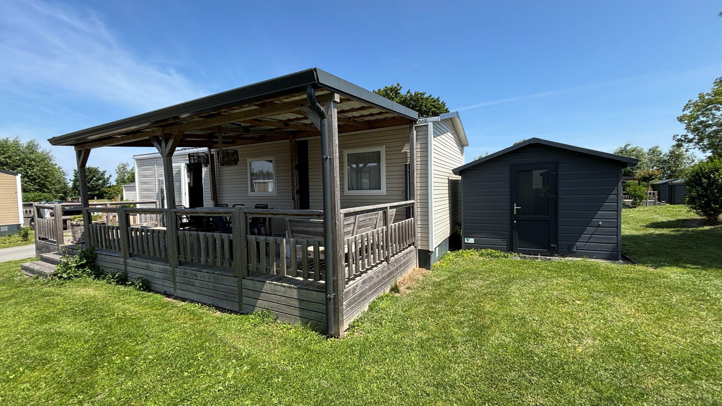 Ein herrlicher Ort, ein schönes Chalet und ein schöner Familiencampingplatz. Alle Zutaten für einen tollen Urlaubsort. Das Chalet verfügt über 3 Schlafzimmer, davon 1 großes Schlafzimmer mit einem Doppelbett und 2 Kinderzimmer mit jeweils zwei Einzelbetten. Die U-förmige Küche ist mit einem Backofen und einem Geschirrspüler ausgestattet und spielerisch vom Sitz- und Essbereich abgetrennt. Es gibt ein schönes Badezimmer und eine separate Toilette. Das Wohnzimmer bietet Blick auf die Veranda, auf der Sie morgens ein Croissant und abends einen leckeren Drink genießen können. Können Sie es sich schon vorstellen? Im Garten steht ein Kunststoffschuppen, praktisch für Gartengeräte oder Fahrräder, und auf dem Grundstück kann geparkt werden.
