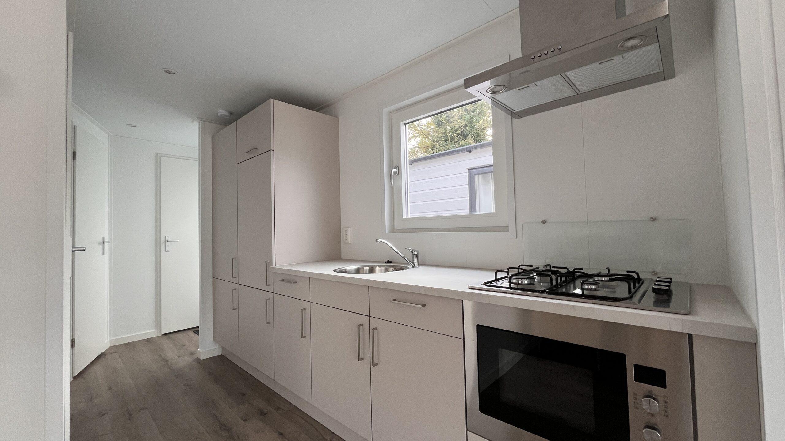 Das Chalet verfügt über eine robuste Küche mit Gasherd, Dunstabzugshaube und Einbau-Kühl-Gefrierkombination. Außerdem gibt es ein geräumiges Wohnzimmer, zwei Schlafzimmer mit guten Betten und ein Badezimmer mit Dusche, Toilette und Waschbecken. Vom Zimmer aus gelangt man durch Flügeltüren in den Garten. Kurz gesagt: eine hervorragende Aufteilung in schönen modernen Farben.