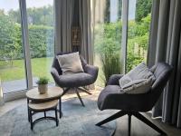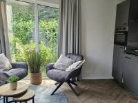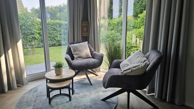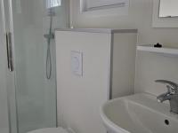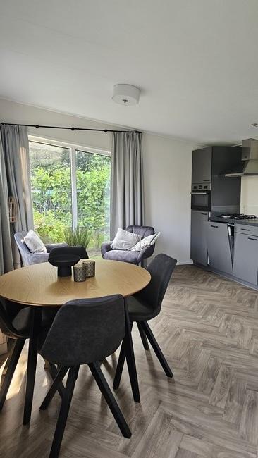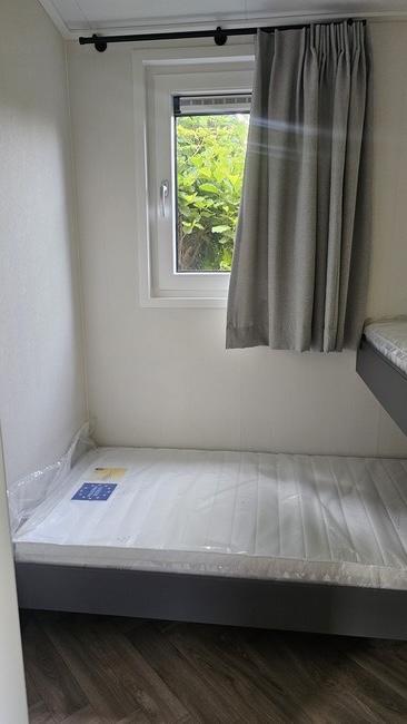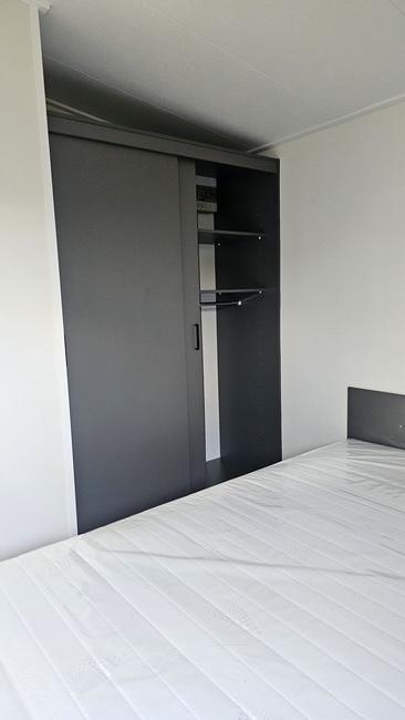 Es handelt sich um ein hochwertiges Chalet mit einem Pultdach in Naturfarben und Schiebetüren zur Terrasse. Zur weiteren Ausstattung gehören eine moderne Küche mit Geschirrspüler und Kombi-Mikrowelle, ein Badezimmer mit Dusche, Waschtischunterschrank, freistehendem WC und Handtuchheizkörper. Das Chalet hat zwei Schlafzimmer. Das Hauptschlafzimmer hat einen festen Schiebeschrank mit Boxspringbett. Das andere Schlafzimmer hat ein Etagenbett. Das Chalet wird durch eine Zentralheizung beheizt.