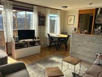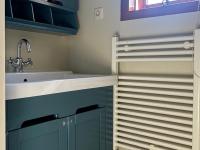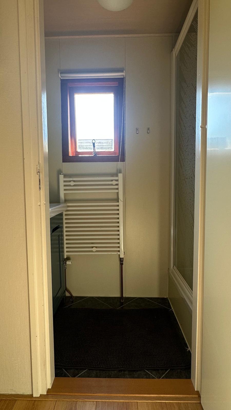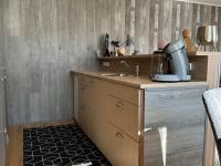 De compacte keuken heeft een spoelbak, koelkast en voldoende werk- en opbergruimte. De open verbinding met de woonruimte zorgt voor een ruimtelijk gevoel en maakt het een gezellige plek waar koken en leven samen komen.