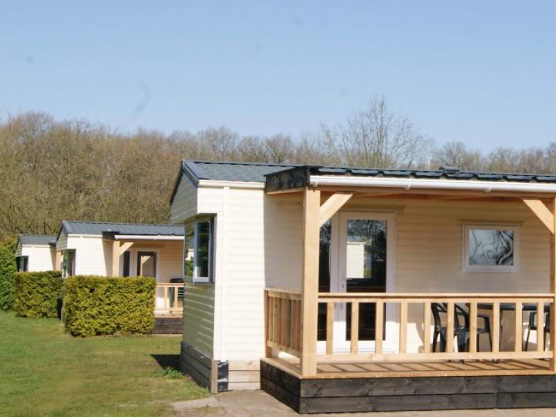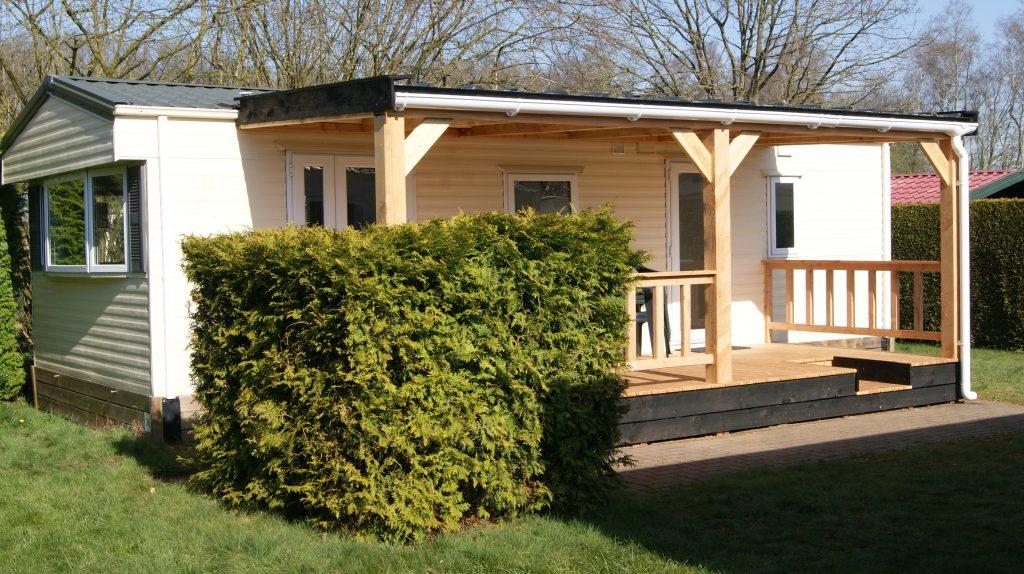 Dit chalet met veranda staat nu te koop in een bosrijke omgeving op Camping Alkenhaer in Appelscha, Friesland!