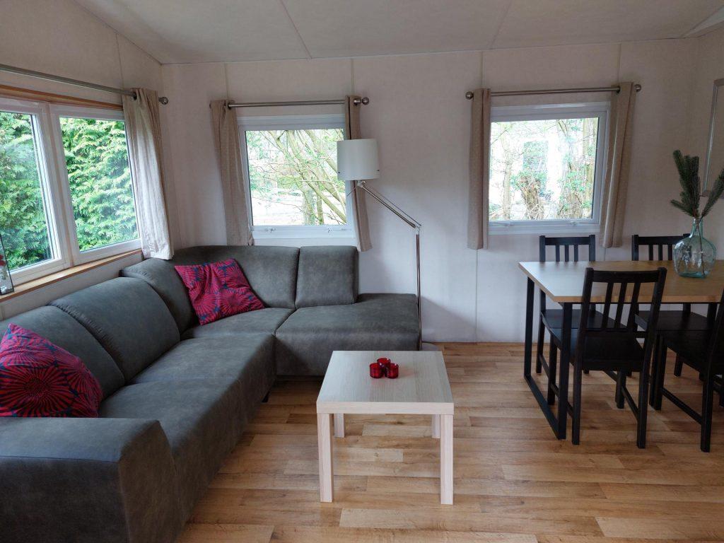Het chalet wordt compleet geleverd met een grote bank, salontafel, schemerlamp, tv + meubel en in het eetgedeelte staat een tafel met 4 stoelen. Voor de ramen hangen gordijnen voor extra privacy en de ruimte wordt verwarmd door middel van een Trumakachel.
