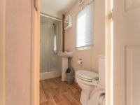 De badkamer heeft een douchecabine, toilet en een wastafel met spiegel.