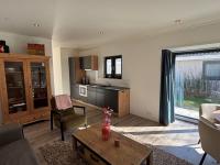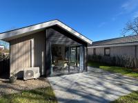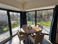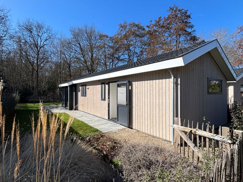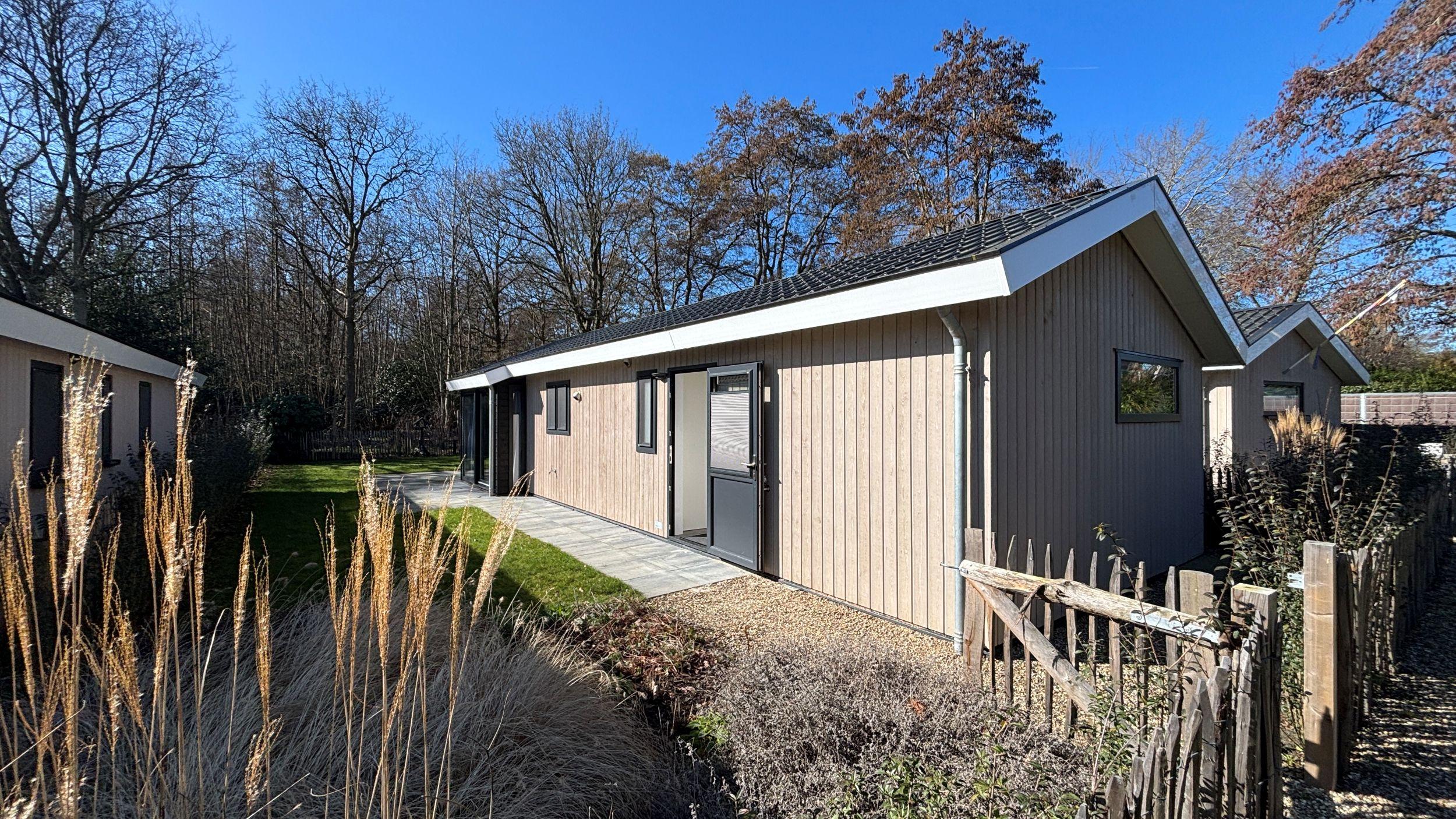 Het comfortabele chalet, op kavel 5 is gebouwd van hoogwaardige materialen. De hoge nok en mooie erker in de woonkamer geven een enorm ruimtelijk gevoel. Verder is er de complete keuken met veel kastruimte, vaatwasser, inductiekookplaat, combimagnetron en koel- vriescombinatie.