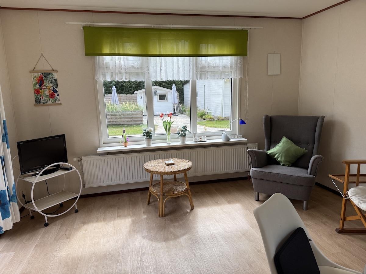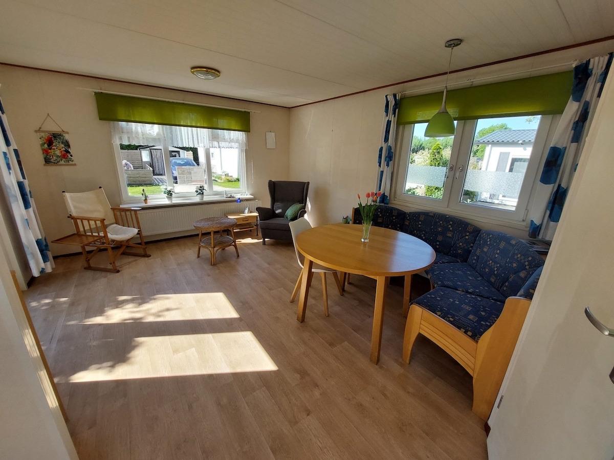 Deze luxe stacaravan/ chalet is voorzien van ruime woonkamer met openslaande tuindeuren. Gezellige vaste halfronde eethoek en zeer ruime keuken.