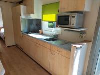 De keuken is voorzien, van een gastel met afzuigkap, combimagnetron en koelkast met vriesvak en veel kastruimte.