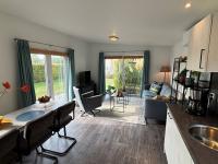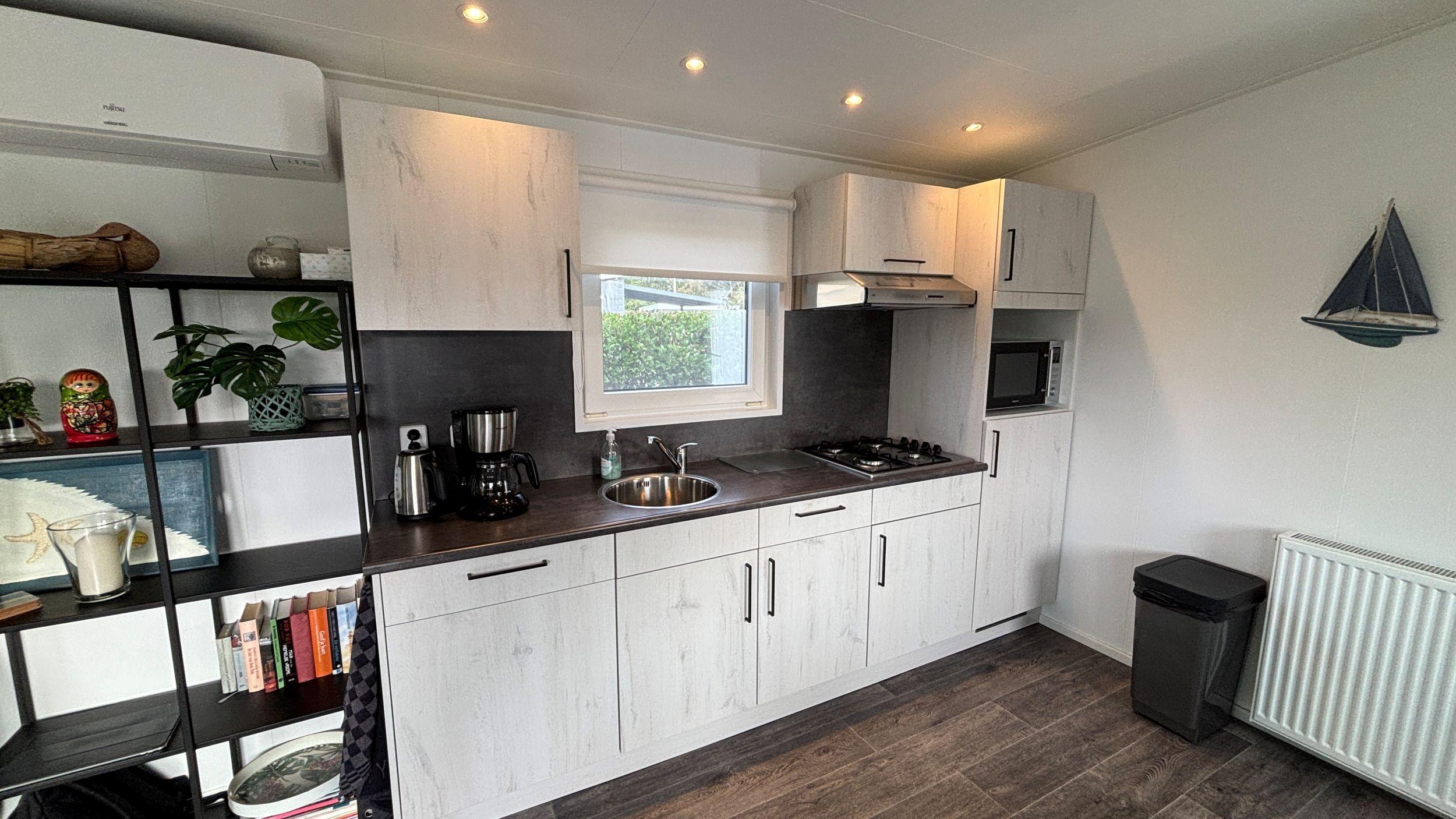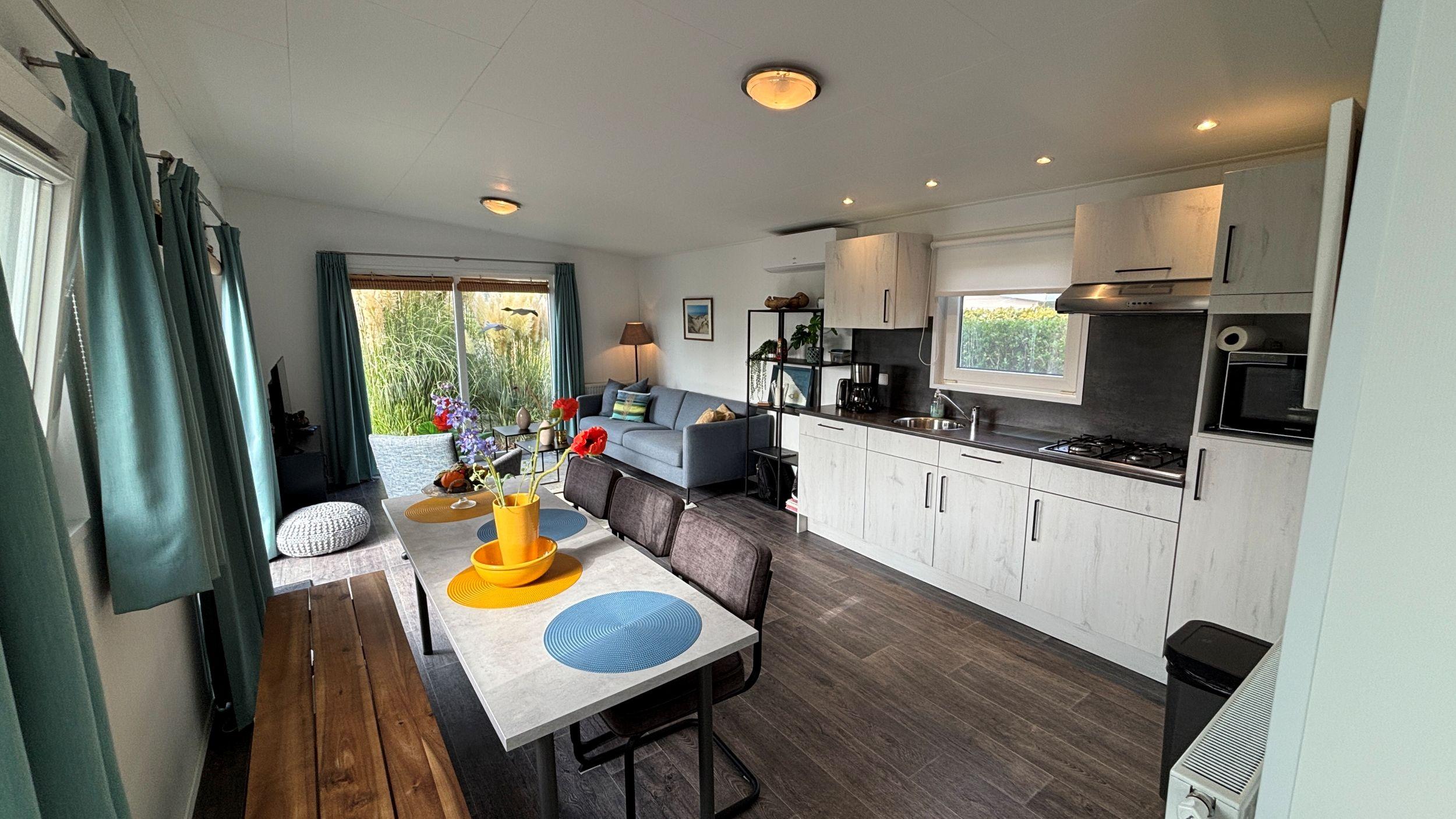 Het chalet heeft een unieke indeling die direct opvalt zodra je binnenstapt. Je komt binnen in een ruime hal met voldoende plek voor jassen en schoenen, van waaruit je eenvoudig doorloopt naar de rest van het chalet. De moderne keuken, geplaatst aan de lange wand van het chalet, zorgt voor een open en lichte leefruimte met een gezellige eethoek, perfect voor lange ontbijten of een goed glas wijn aan het eind van de dag.