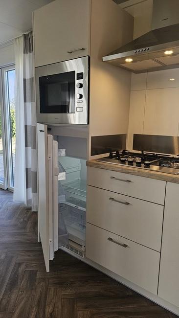 Het crème kleurig kunststof chalet met antraciet kozijnen is van alle gemakken voorzien en heeft 3 slaapkamers. Een masterbedroom met box spring bed (160x200) en vaste kasten. De volgende slaapkamer heeft 2 losse bedden (80x200). De derde slaapkamer heeft één bed (80x200). Verder heeft het chalet een ruime badkamer met comfortabele douche met badmeubel. Het toilet zit in een aparte ruimte. Het chalet heeft een luxe keuken met onder andere koel-/vriescombinatie, vaatwasser en combimagnetron.