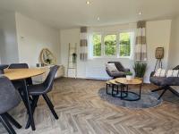 De living is ruim en licht door de grote raampartijen met schuifpui naar de tuin. Een eigentijds design gecombineerd met moderne kleuren.