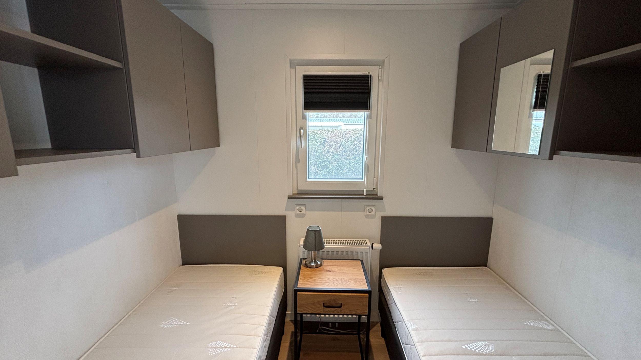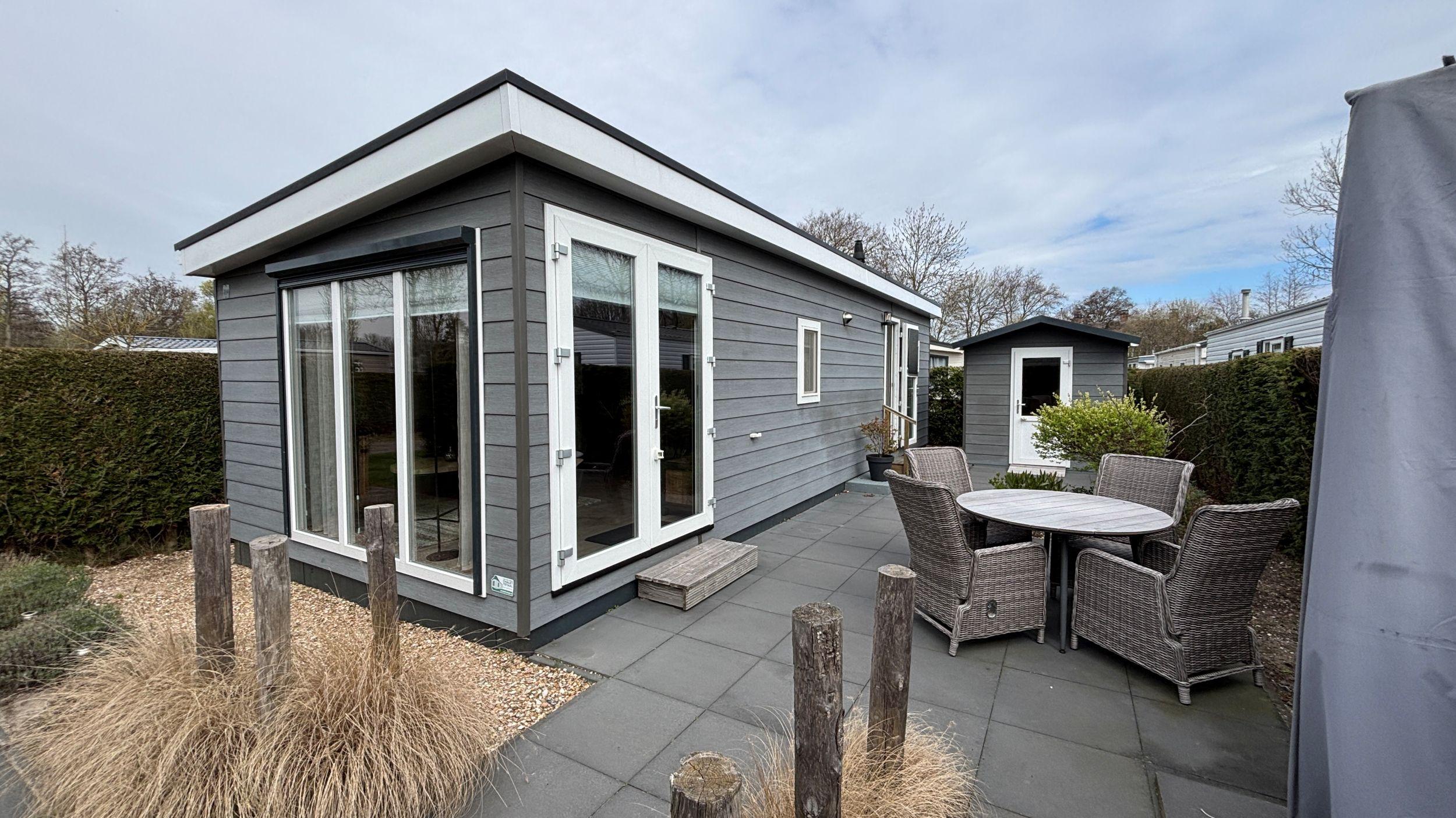 Een indrukwekkend chalet met mooie raampartijen zodat er volop genoten kan worden van de fijne kavel. De keuken is voorzien van een ingebouwde koelkast en vriesvak, inbouw combi-magnetron, een vaatwasser en voldoende kastruimte. Het chalet heeft 2 slaapkamers met inbouwkasten en een luxe badkamer. Het chalet wordt verkocht met het complete inventaris. Van bestek, de luxe meubelen tot aan het tuingereedschap en tuinmeubelen aan toe. Wat ook erg fijn is, is dat het chalet voorzien is van horren en een zonnescreen aan de kopse kant. De tuin ligt perfect op de zon en is eenvoudig te onderhouden.