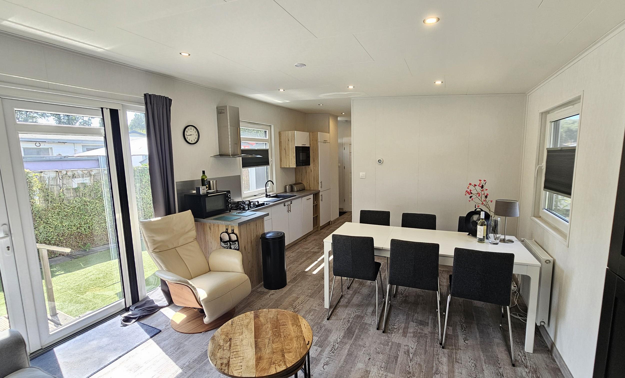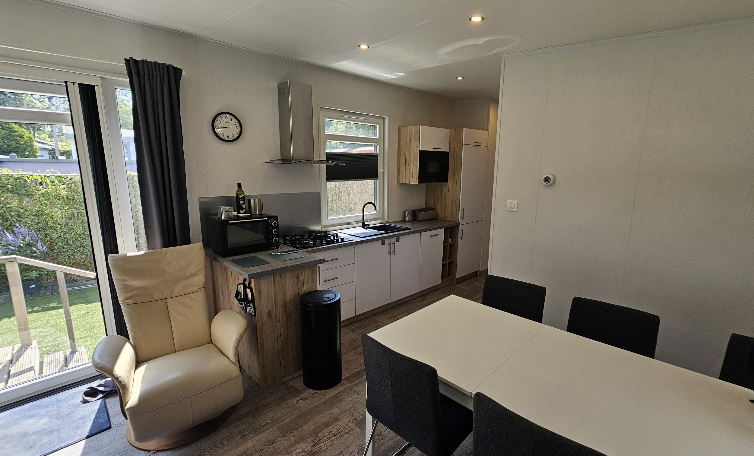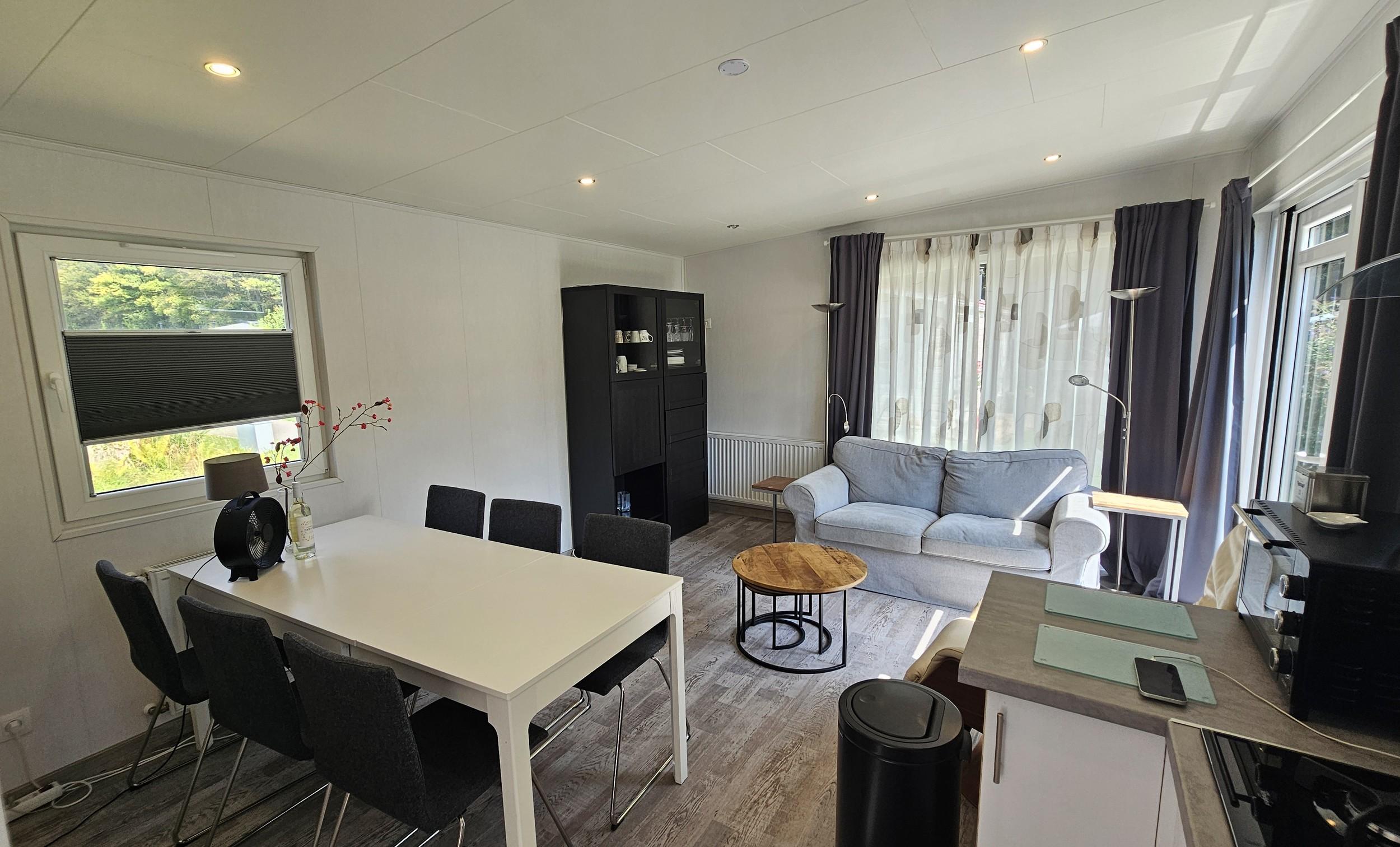 Het chalet heeft een lichte living met grote raampartijen met onder meubilair, eettafel met stoelen en openslaande deuren naar het terras, keuken en badkamer met douche, wastafel en toilet. Verder heeft het chalet 2 slaapkamers. 1 met tweepersoonsbed en opbergkast. De andere slaapkamer heeft 2 éénpersoonsbedden met bovenkastjes.