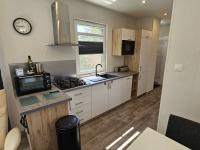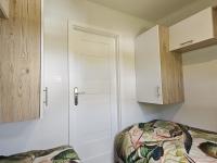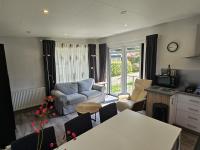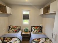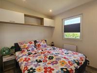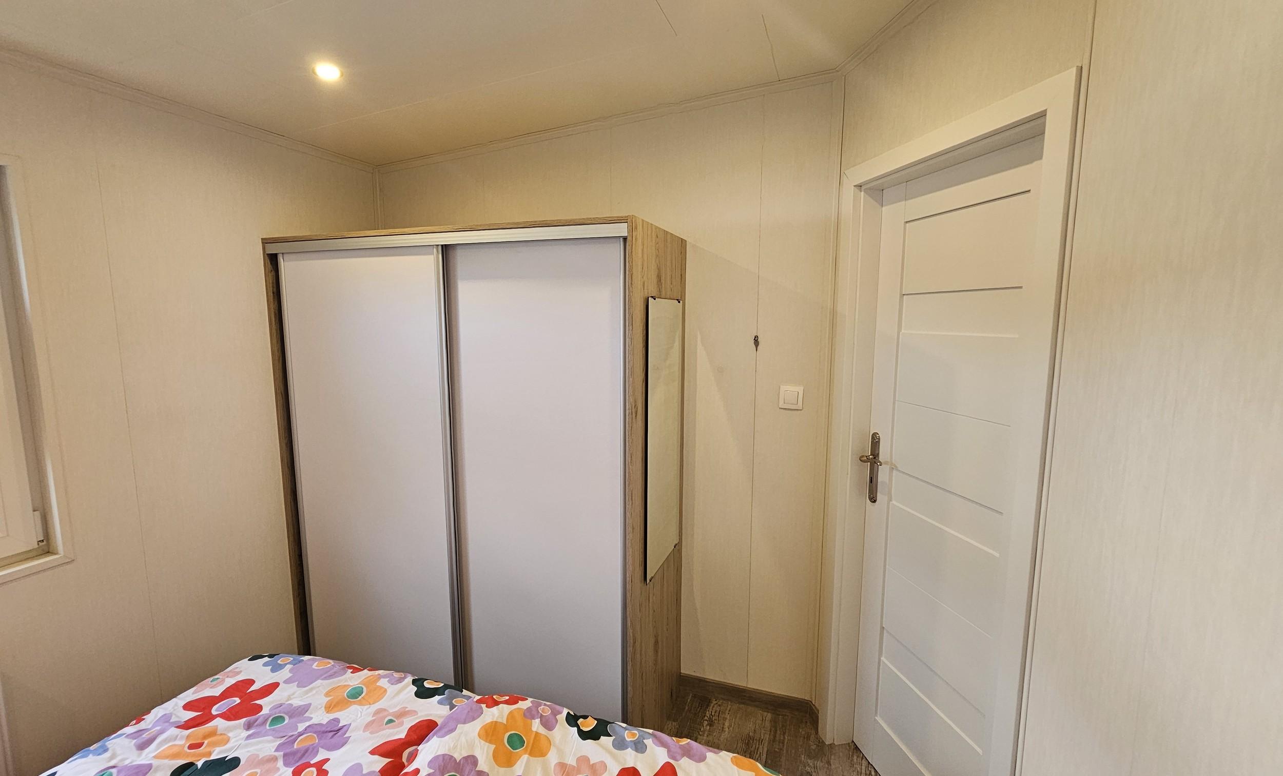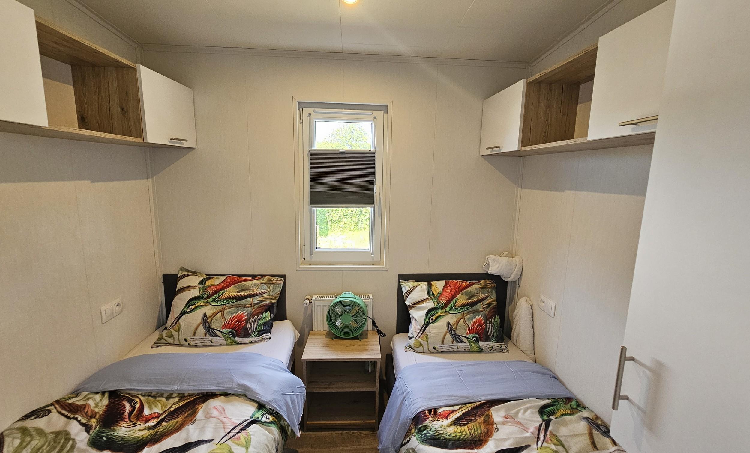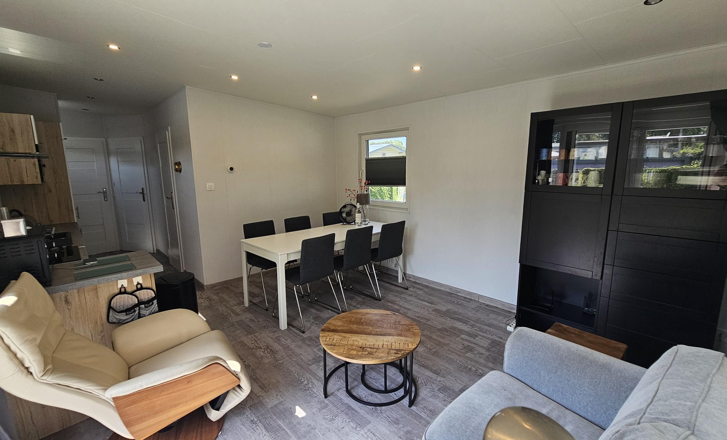 Het chalet heeft een lichte living met grote raampartijen met onder meubilair, eettafel met stoelen en openslaande deuren naar het terras, keuken en badkamer met douche, wastafel en toilet. Verder heeft het chalet 2 slaapkamers. 1 met tweepersoonsbed en opbergkast. De andere slaapkamer heeft 2 éénpersoonsbedden met bovenkastjes.