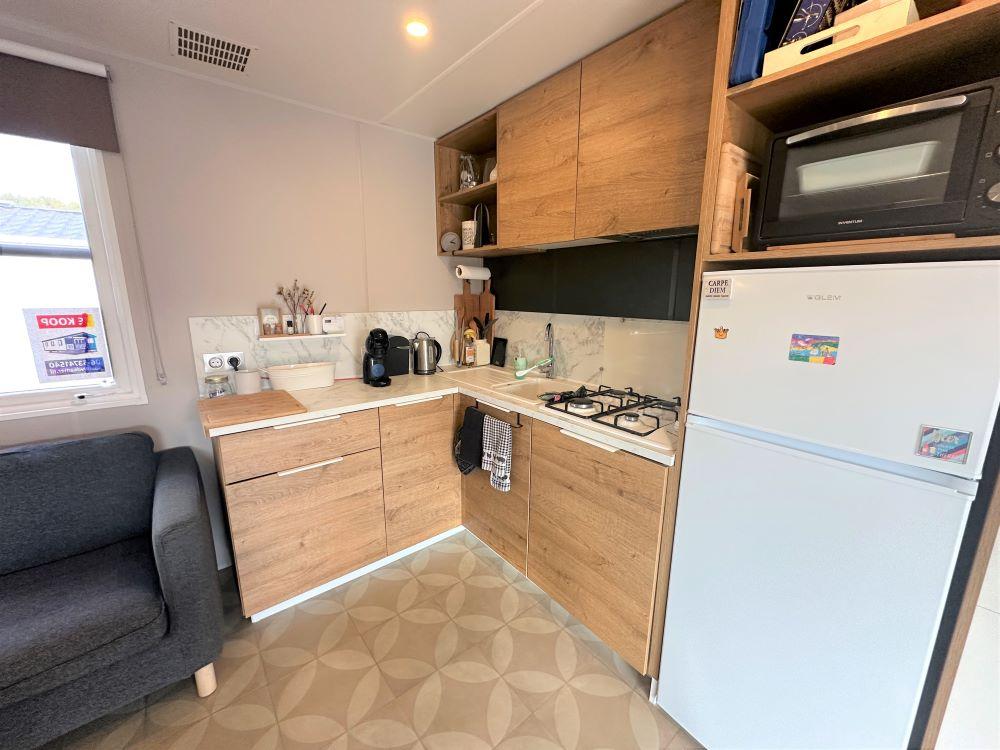 De hoekkeuken heeft een prachtige afwerking en beschikt over een koelkast met vriesvak, een combimagnetron en een gasstel inclusief afzuigkap.