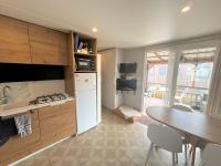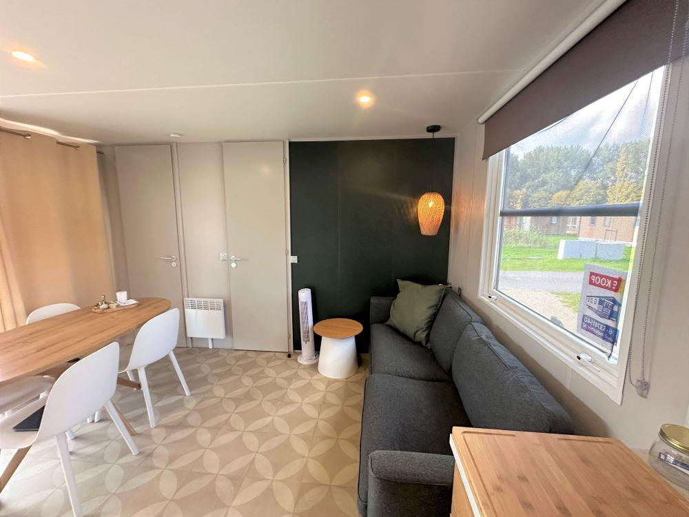 Het hart van de woning is de living. Door de vele raampartijen en de schuifpui geniet u hier van veel natuurlijk lichtinval. Bovendien zorgt dit voor een prettig uitzicht naar buiten toe. In de living vindt u de loungehoek, de eethoek en de hoekkeuken. De loungehoek is voorzien van een bank. De eethoek bestaat uit een eettafel en vier stoelen. In deze ruimte hangt ook een tv. Door de CAI-aansluiting kunnen tv-zenders worden ontvangen en ook internet is aanwezig.